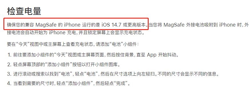 側面介紹了MagSafe磁吸無線充電寶需要搭配最新的iOS系統版本才可使用。