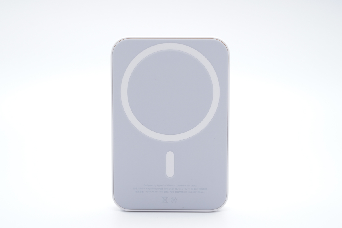 目前蘋果MagSafe磁吸無線充電寶只有白色一個版本,采用親膚材質,摸上去質感很好,并且不留指紋,中間靠上的位置是蘋果的品牌Logo。