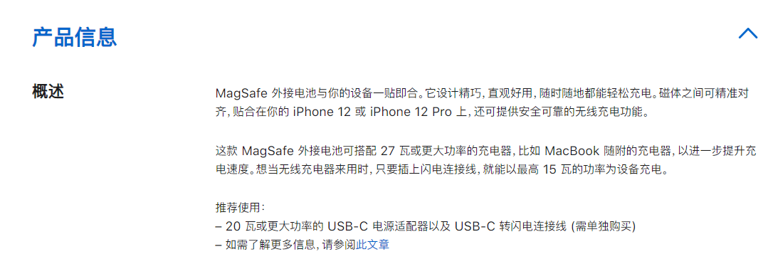 在官網上蘋果對于新款MagSafe磁吸無線充電寶的介紹為需要iPhone 12的iOS系統版本為14.7或更高版本。