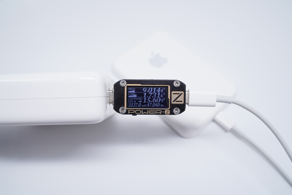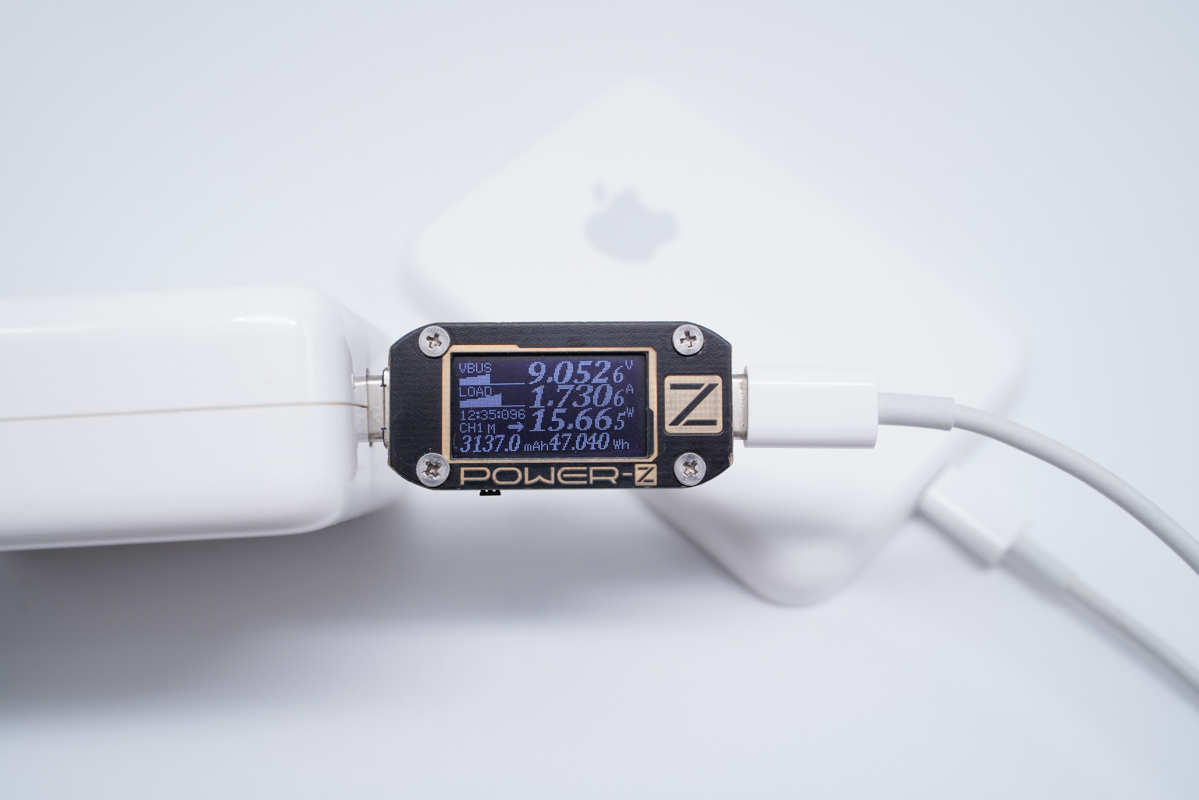 使用蘋果87W PD充電器為充電寶充電,功率為9.01V 1.73A 15.6W。