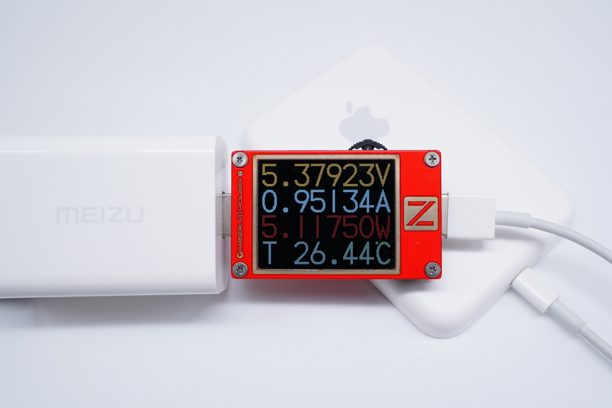 首先使用蘋果18W PD充電器為充電寶充電,功率為8.76V 1.92A 16.86W。