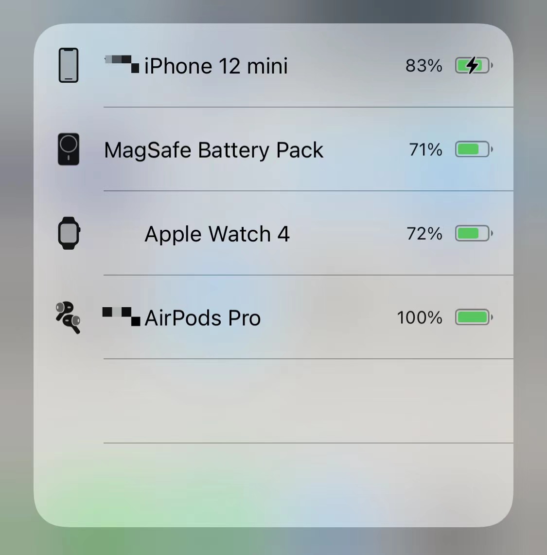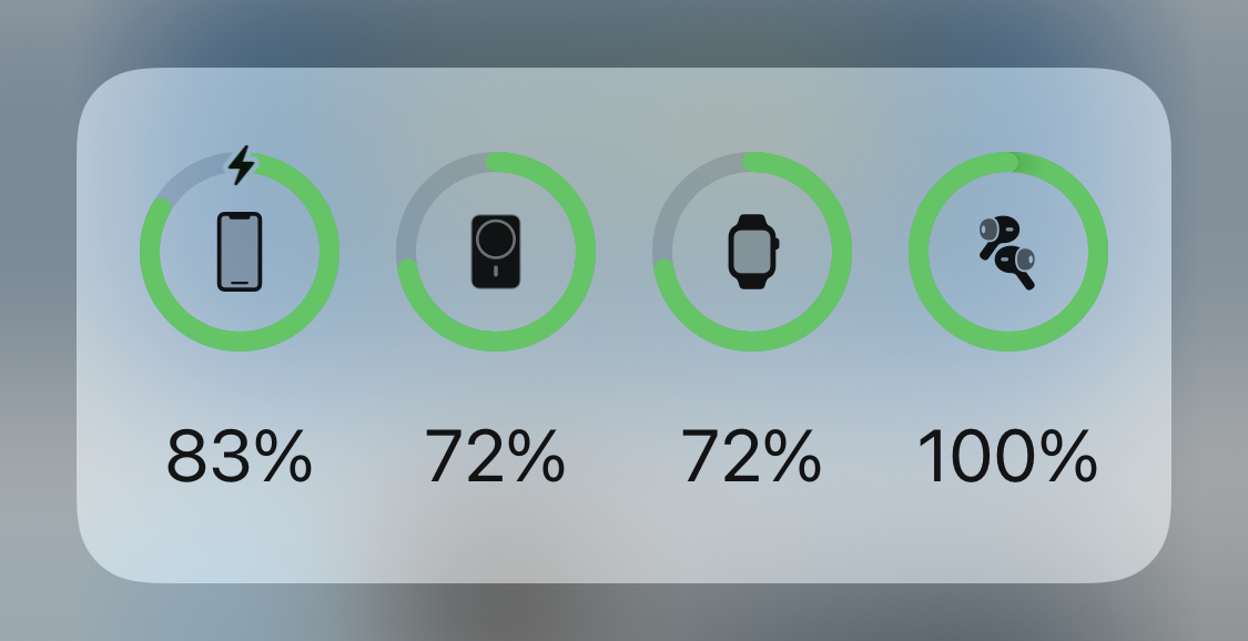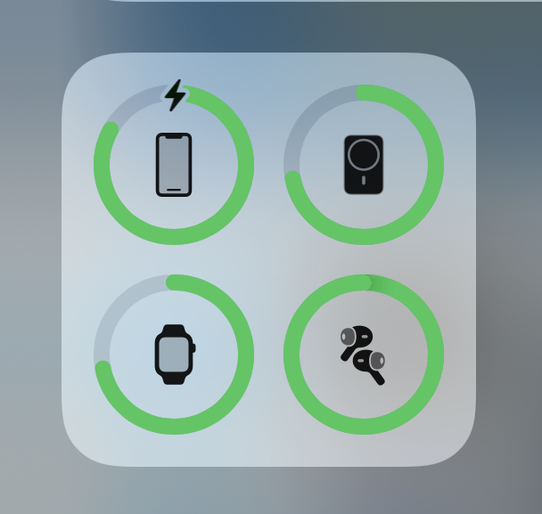 如果同時擁有iPhone 12、Apple Watch、AirPods以及MagSafe充電寶的話,就可以在系統自帶的電池小組件里直接查看各個設備的電量情況。