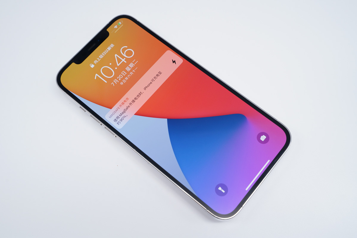 首先將充電寶吸附在iPhone 12背面,此時手機中彈出了為iPhone 12磁吸充電的標識,同時下面新增了一個小標識,這就是充電寶的電量顯示。