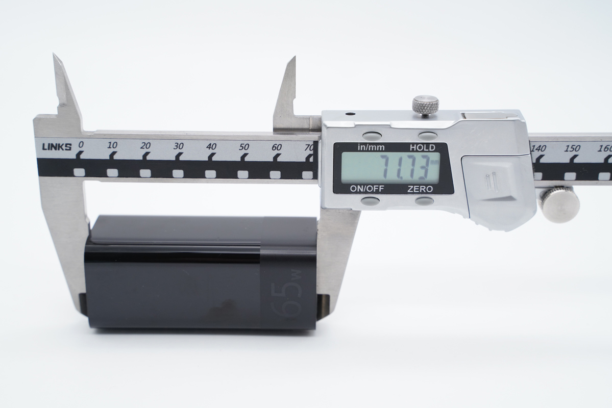 使用卡尺實測ZMI紫米65W氮化鎵充電器(1C1A)的長度約為71.73mm(不含插腳)。