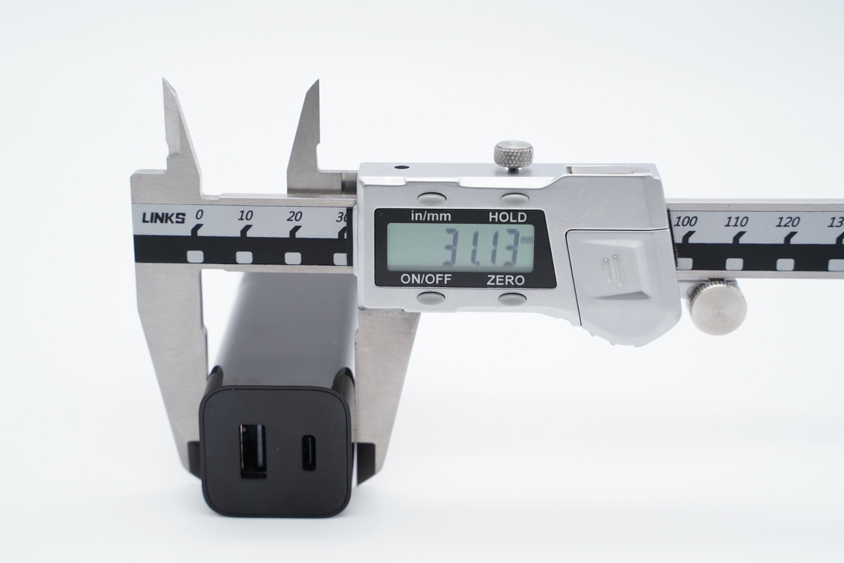 由此可以得出充電器的三圍參數為71.73x31.13x31.13mm,充電器的體積約為69.51cm3,以最高輸出65W計算,功率密度約為0.93W/cm3。折疊插腳占據了充電器內部的一定空間,不過這樣的功率密度在目前的多口氮化鎵充電器領域已屬領先地位。