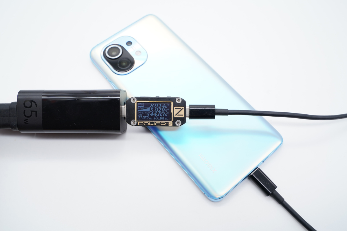 USB-C支持11V5A小米系快充,為小米11充電功率為8.91V 5.02A 44.83W,成功觸發小米私有快充。