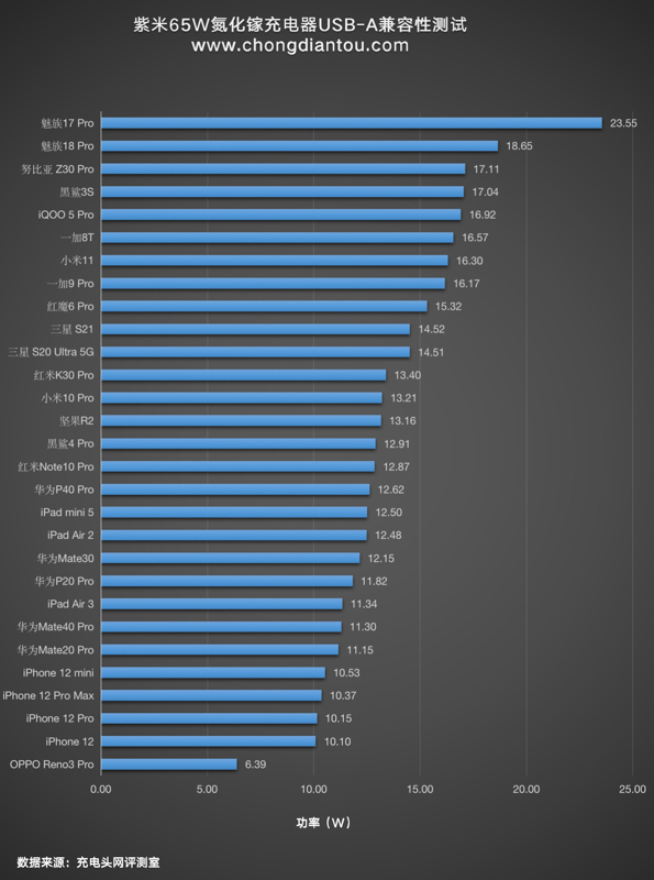 USB-A支持最高18W快充,所以整個柱狀圖看上去較為平緩,只有魅族17 Pro的功率最高,其他設備均處于正常充電狀態。