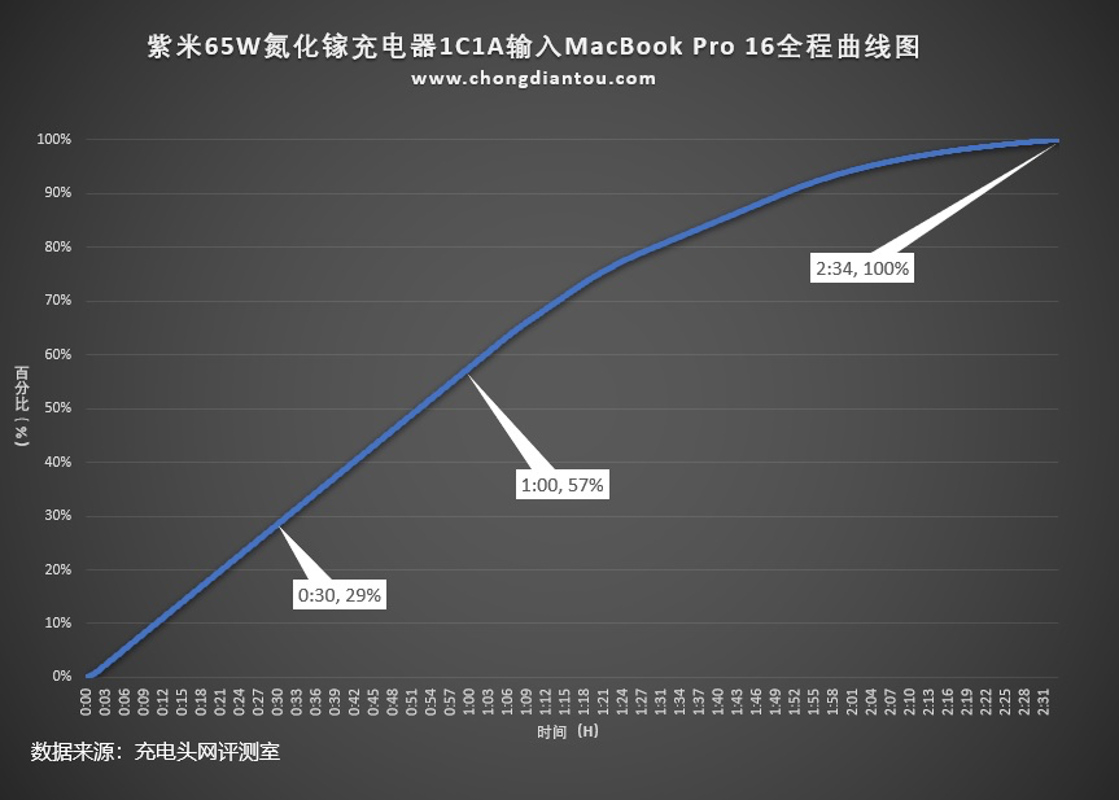 將測試全程繪制成曲線圖,ZMI紫米65W氮化鎵充電器(1C1A)為MacBook Pro 16半小時充電29%,1小時57%,完全充滿需要2小時34分。