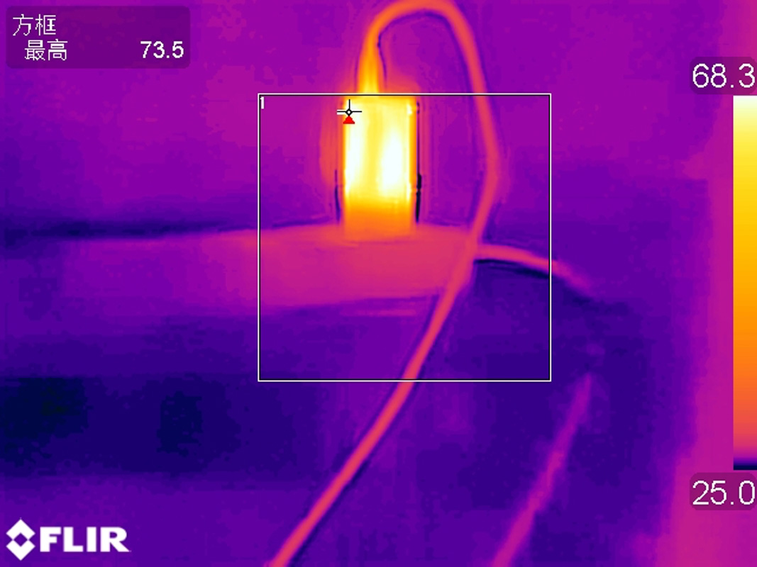 讓充電器以20V3.25A 65W的功率持續滿載輸出1小時后采集到充電器表面的最高溫度為73.5℃。