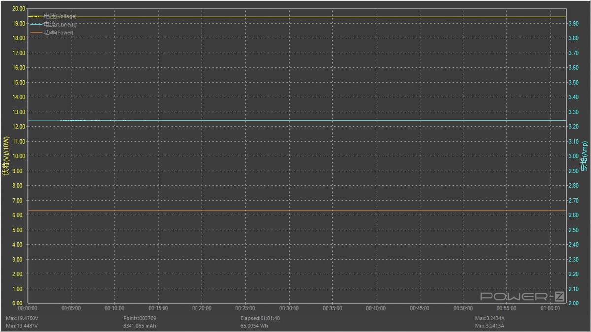 按照額定功率20V 3.25A 65W滿載對充電器進行穩定性測試,測試時間為一小時,測試過程中電壓值呈水平直線,無明顯波動情況,長時間滿載比較穩定。