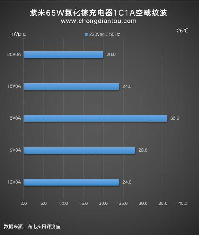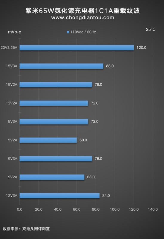 國家標準中充電器紋波要求是不高于200mVp-p,ZMI紫米65W氮化鎵充電器(1C1A)在110V 60Hz、220V 50Hz輸入電壓下,所有輸出功率紋波峰峰值均低于200mVp-p這個標準,表現不錯。