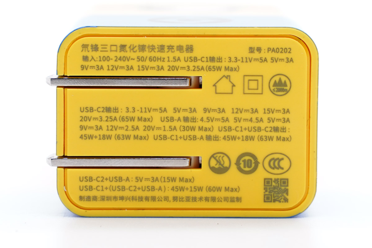 這款聯名款的氮化鎵充電器的型號為PA0202,這款充電器此前充電頭網已經對其進行過評測,這里不再過多介紹。充電器支持100-240V的寬電壓輸入范圍,雙C口獨立使用時支持65W功率盲插,USB-A支持30W快充功率。