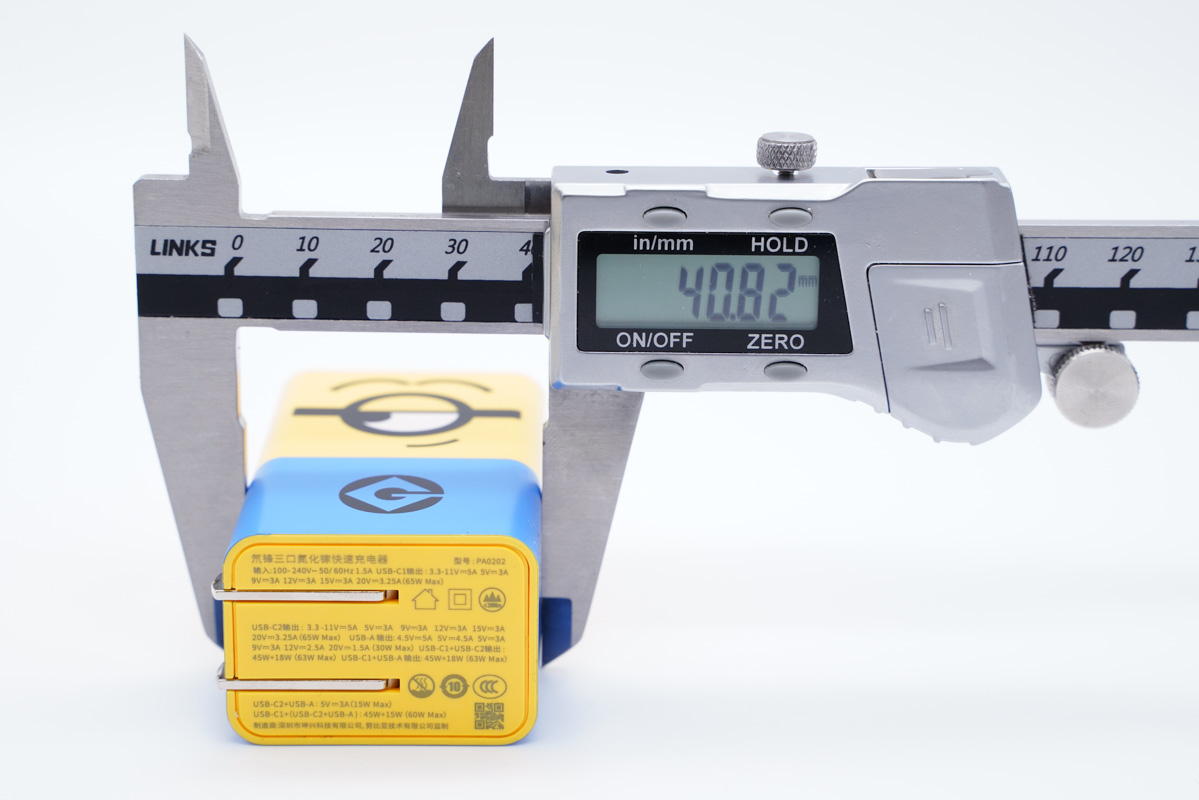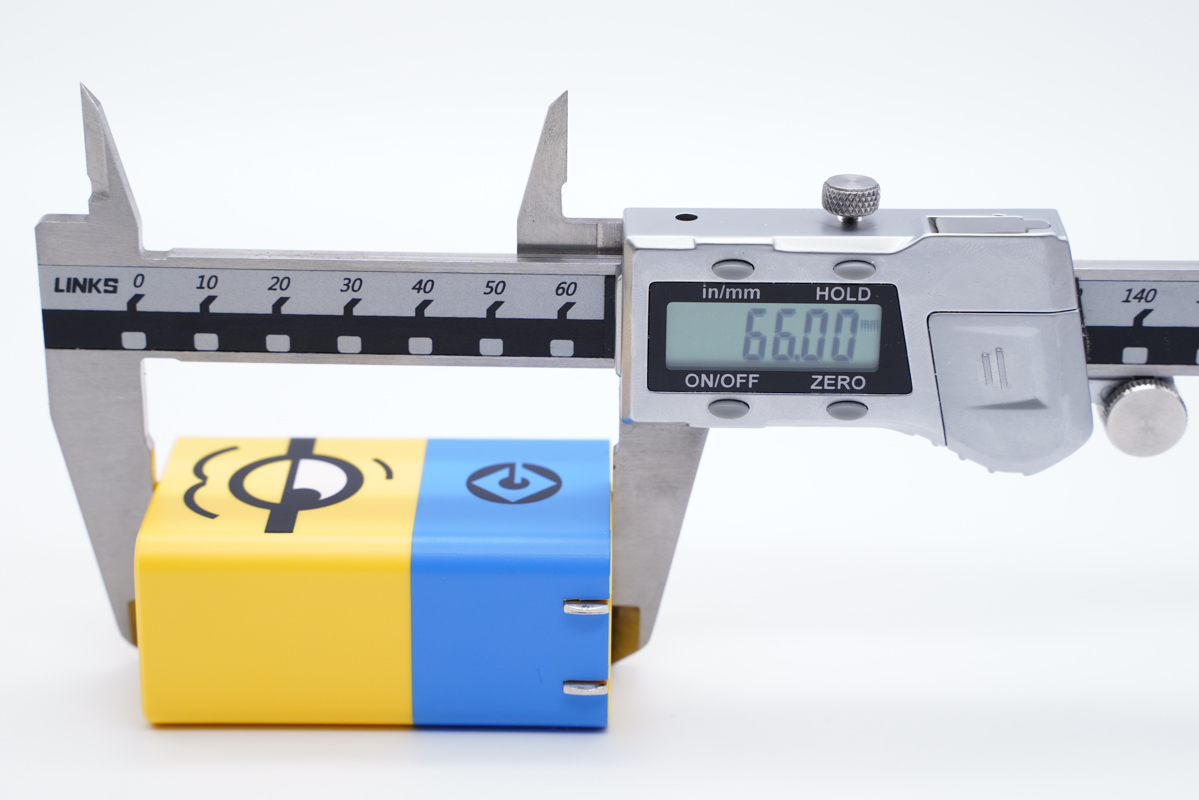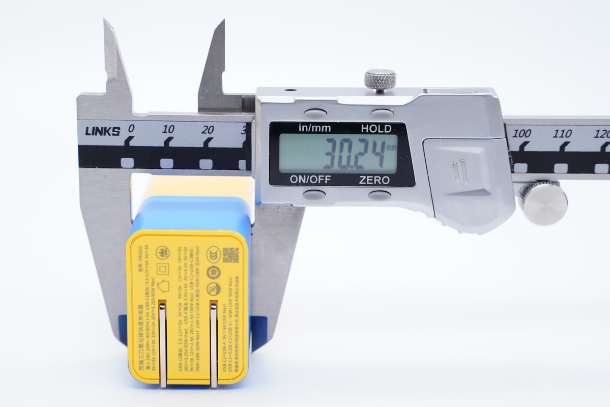 使用卡尺實測充電器的長度約為66mm(不含插腳)。