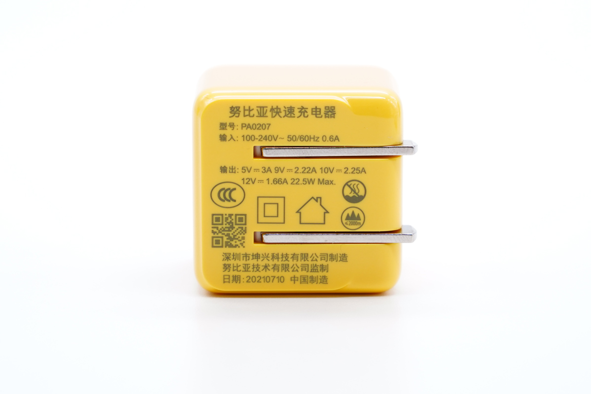 充電器的型號為PA0207,支持100-240V的寬電壓輸入,支持最高22.5W的快充功率。