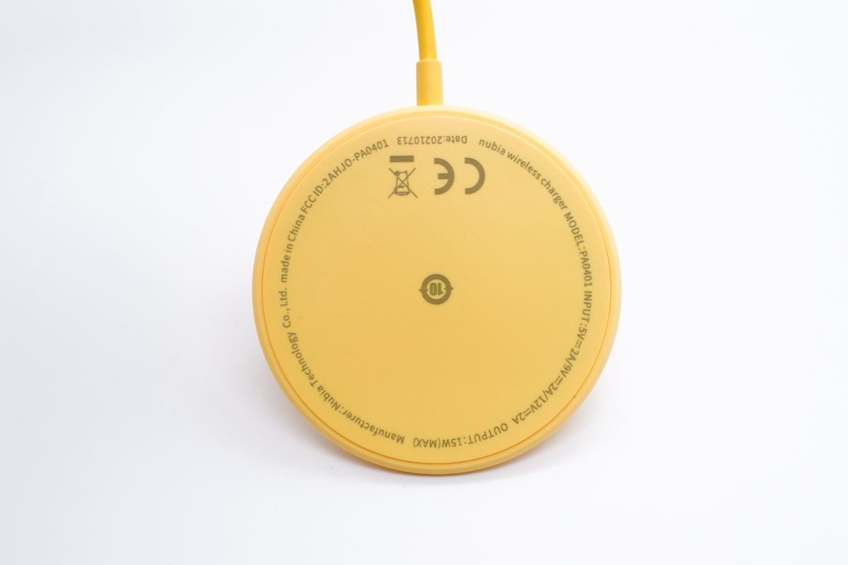 無線充電板正面,四周印著充電器的信息參數,支持最高12V 24W輸入,支持最高15W輸出。