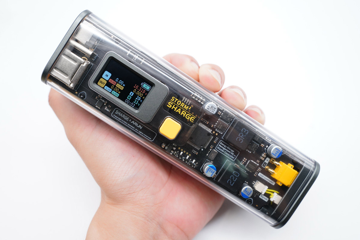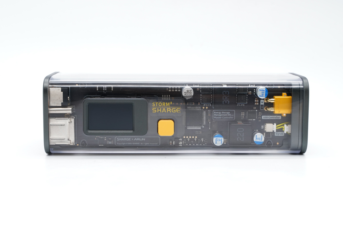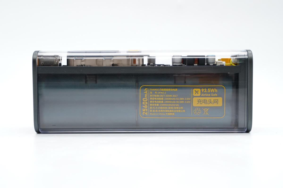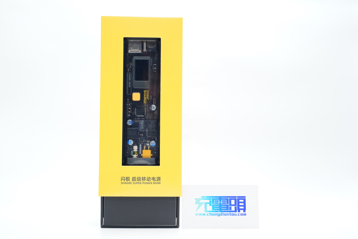 這就是SHARGE閃極最新推出的超級移動電源,從正面可以看出產品采用了透明探索版的設計風格,內部的PCB電路板以及結構一清二楚。