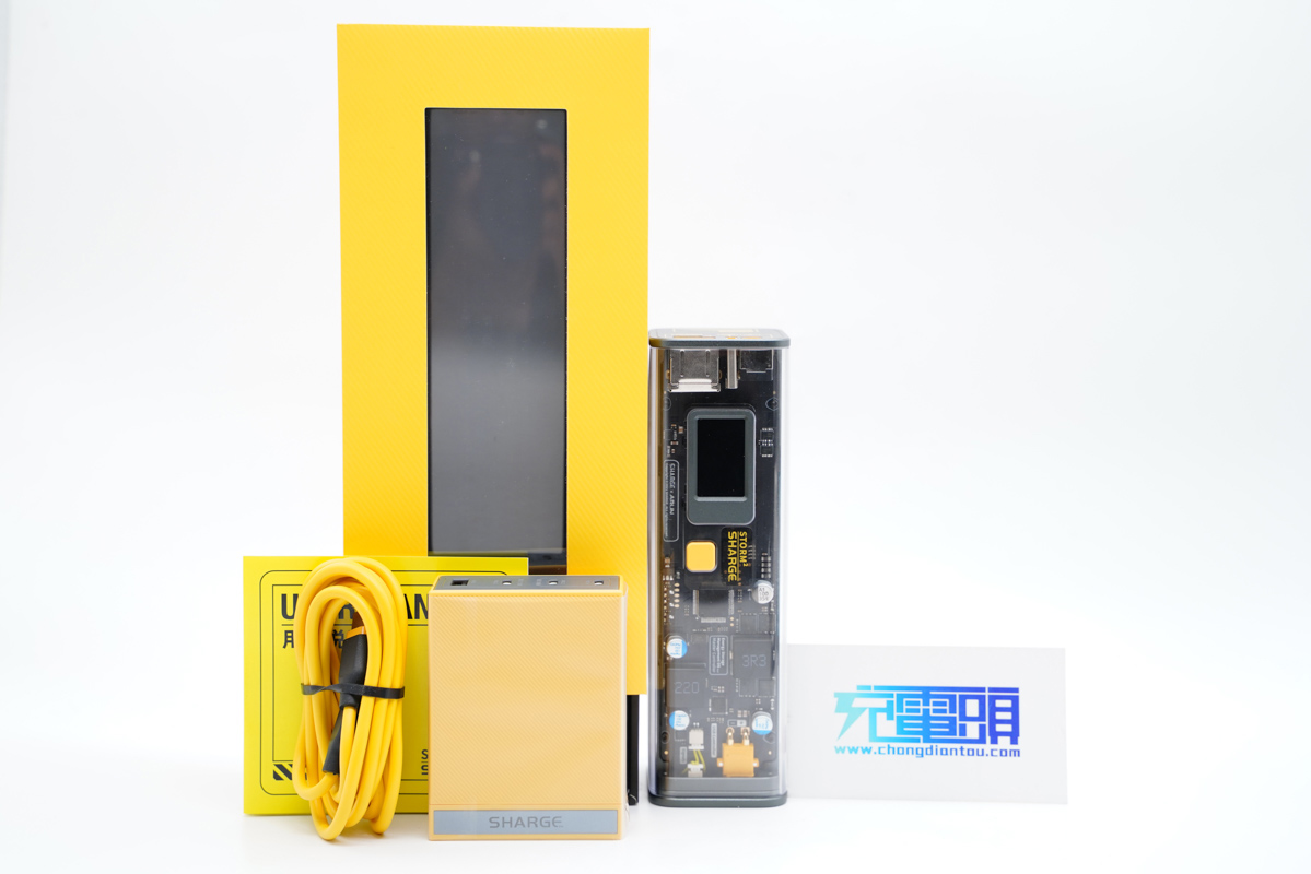 圖上這就是包裝盒內所有的硬件產品了,嚴格意義上來說應該算是兩個新品:SHARGE閃極超級移動電源,和SHARGE閃極氮化鎵充電器100W Pro版,以及快充線材。