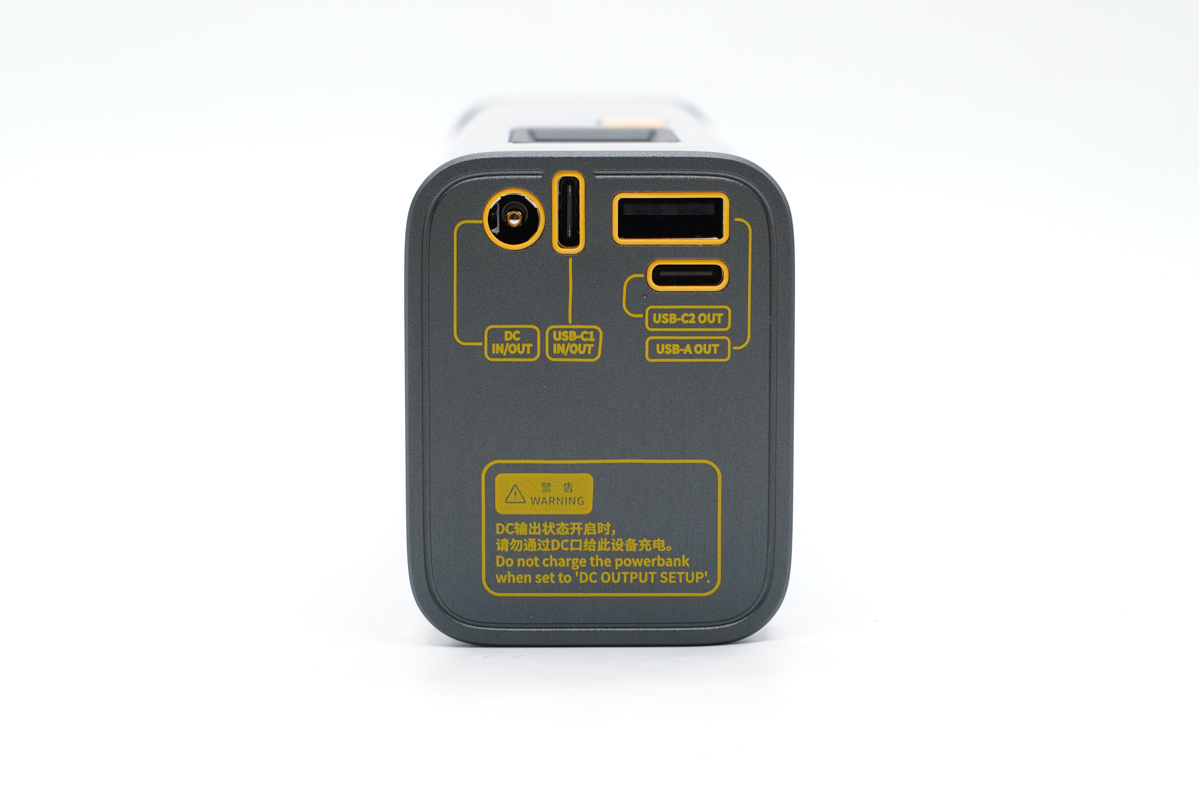 SHARGE閃極超級移動電源的接口全部集中在了側面,分別為DC輸入/輸出接口、USB-C1輸入/輸出接口、USB-C2輸出接口以及USB-A輸出接口。下方還有一條注意事項:DC輸出狀態開啟時,請勿通過DC口給此設備充電。