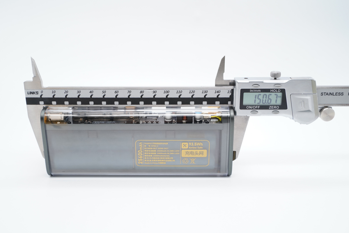 使用卡尺實測SHARGE閃極超級移動電源的長度約為150.67mm。