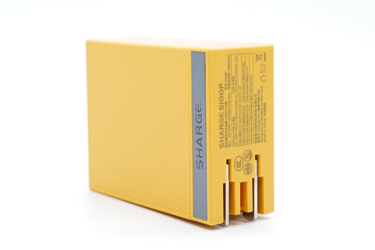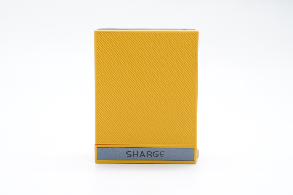黃色的斜條紋殼體上插腳所在的位置帶有灰色的線條,上面印制著SHARGE的品牌Logo。