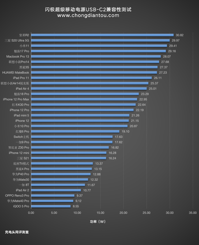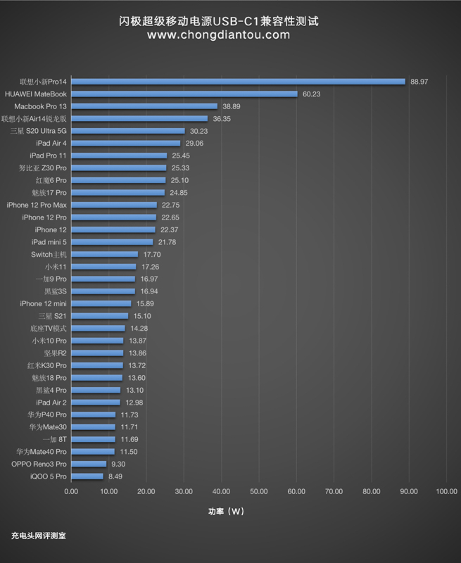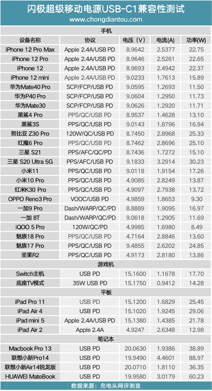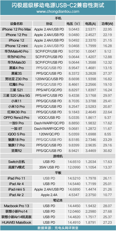 測試數據匯總,USB-C1支持100W PD快充輸出,對筆記本和iPad自然可以滿足功率需求,手機這里大部分都是處于快充狀態,暫未發現不兼容性的情況。