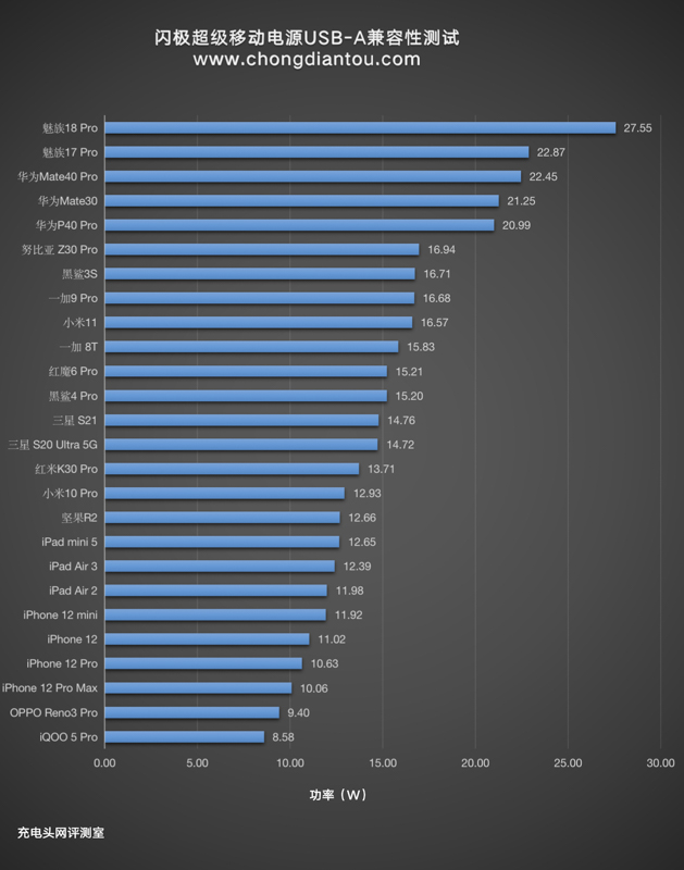 USB-A支持18W快充,不過從測試的數據來看USB-A明顯留出了一定的功率余量,為魅族、華為等機型充電均超過了20W,USB-A接口的整體充電表現還是不錯的。