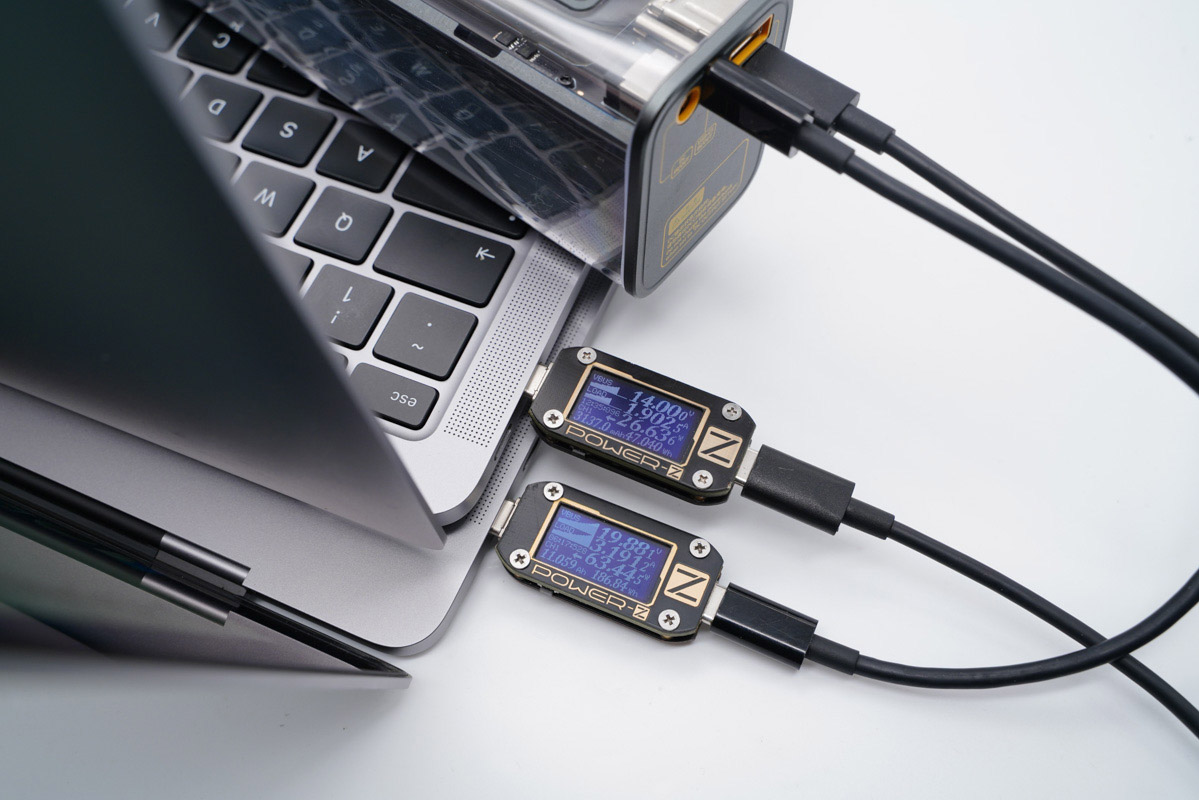 同時使用C1+C2為2臺筆記本電腦充電,C1功率為63.44W,C2功率為26.63W。C1和C2支持同時輸出,且可以滿足2臺筆記本的充電功率。