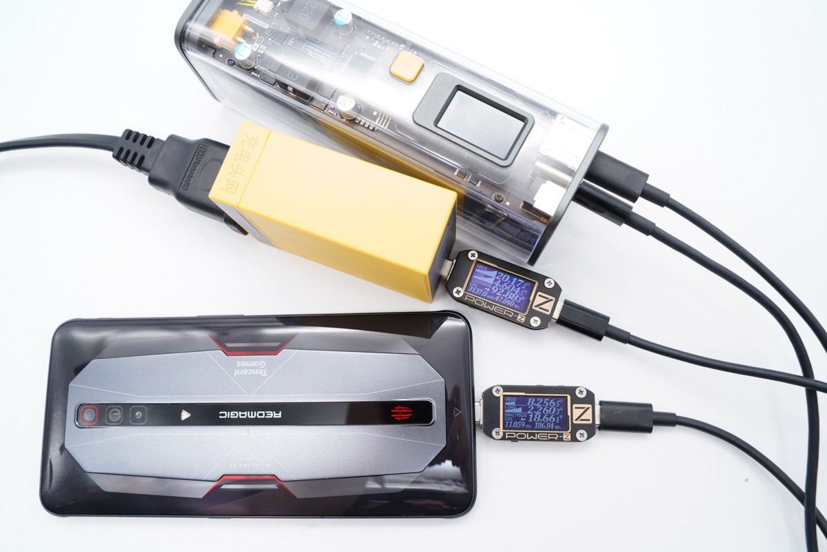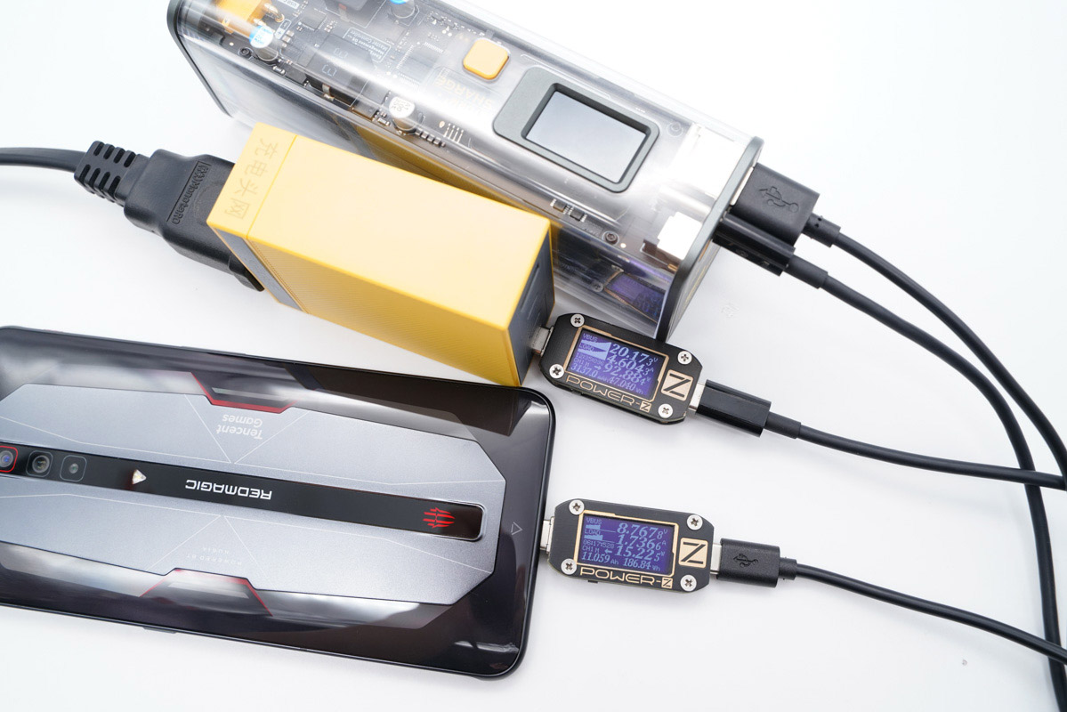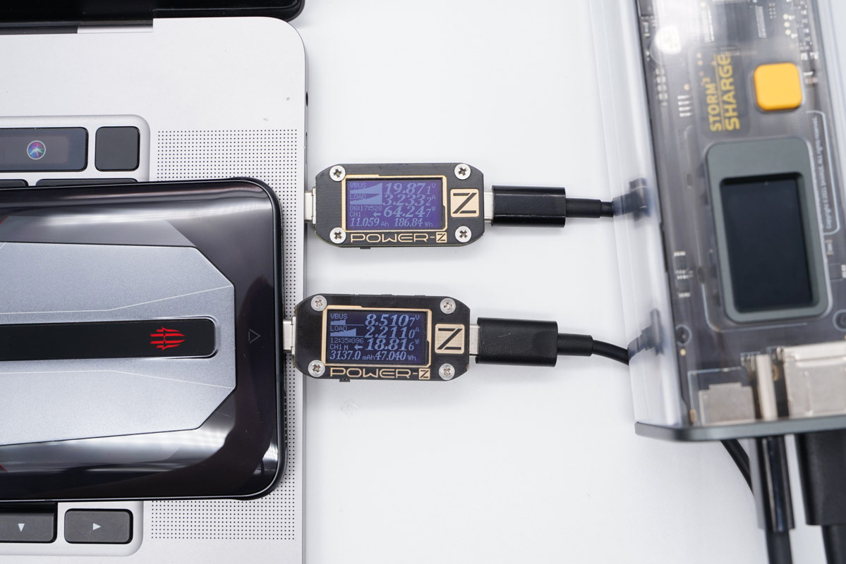 通過C1接口為SHARGE閃極超級移動電源充電,同時使用USB-C2為手機充電,實測可以正常運行且均為快充狀態。