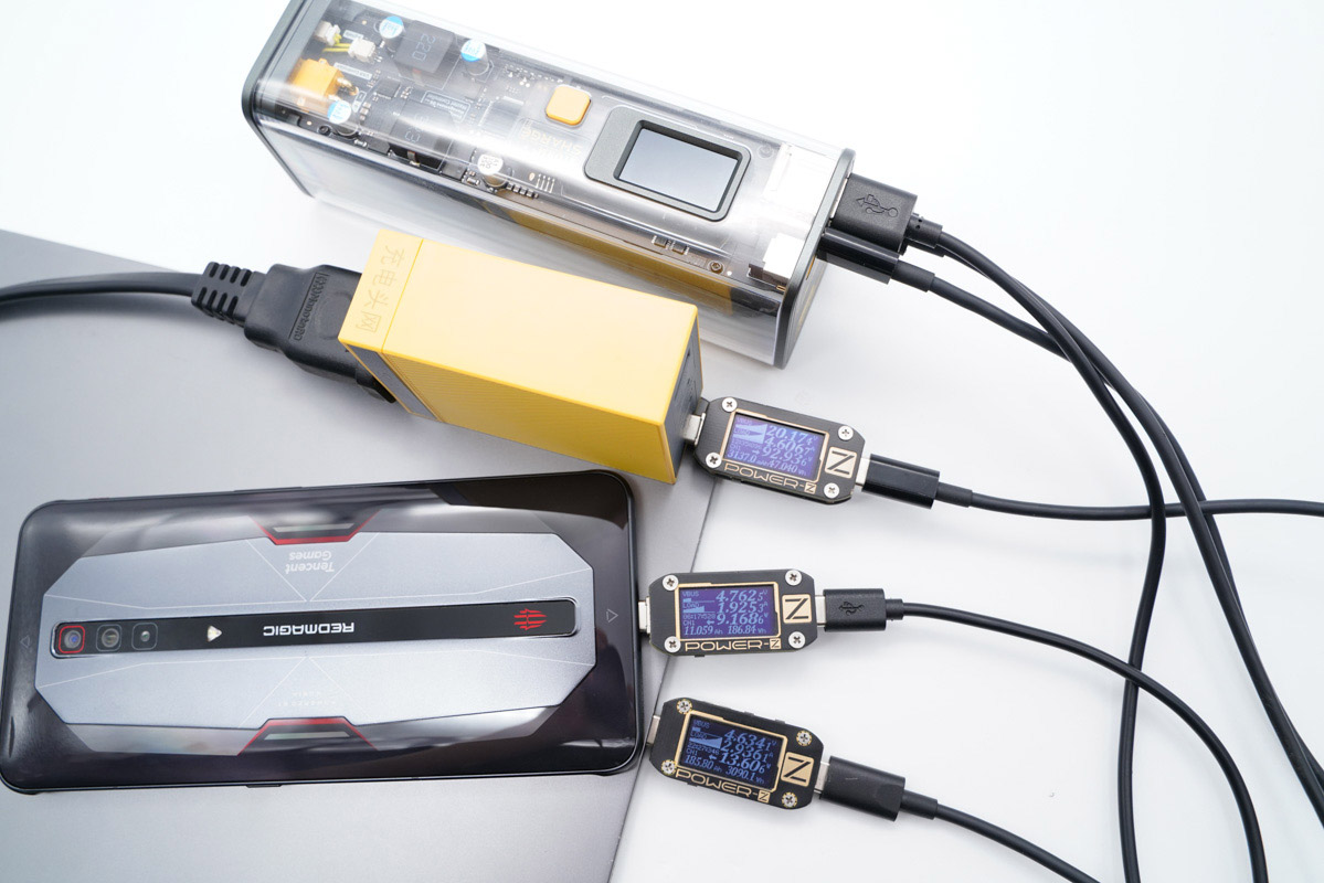 最后通過USB-C1為SHARGE閃極超級移動電源充電,同時使用USB-C2和USB-A輸出為2臺設備充電,SHARGE閃極超級移動電源可以正常運行。