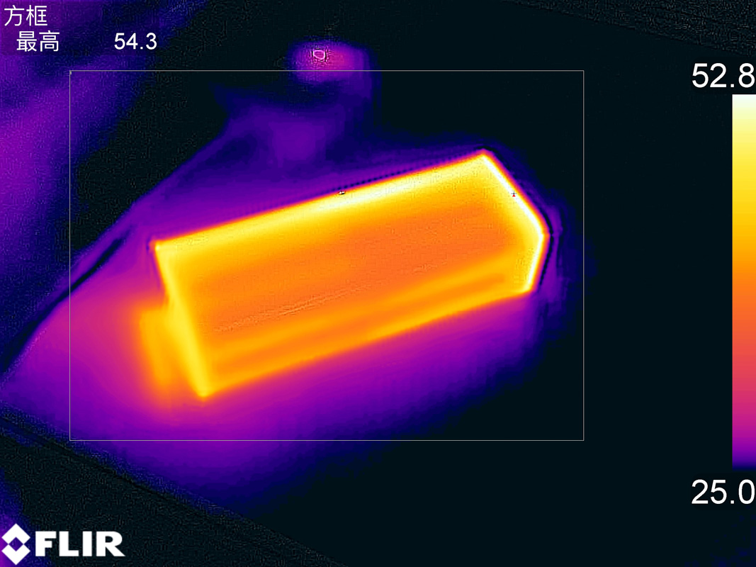讓SHARGE閃極超級移動電源以20V5A 100W的功率持續輸出半小時后采集到充電寶表面最高溫度為54.3℃。