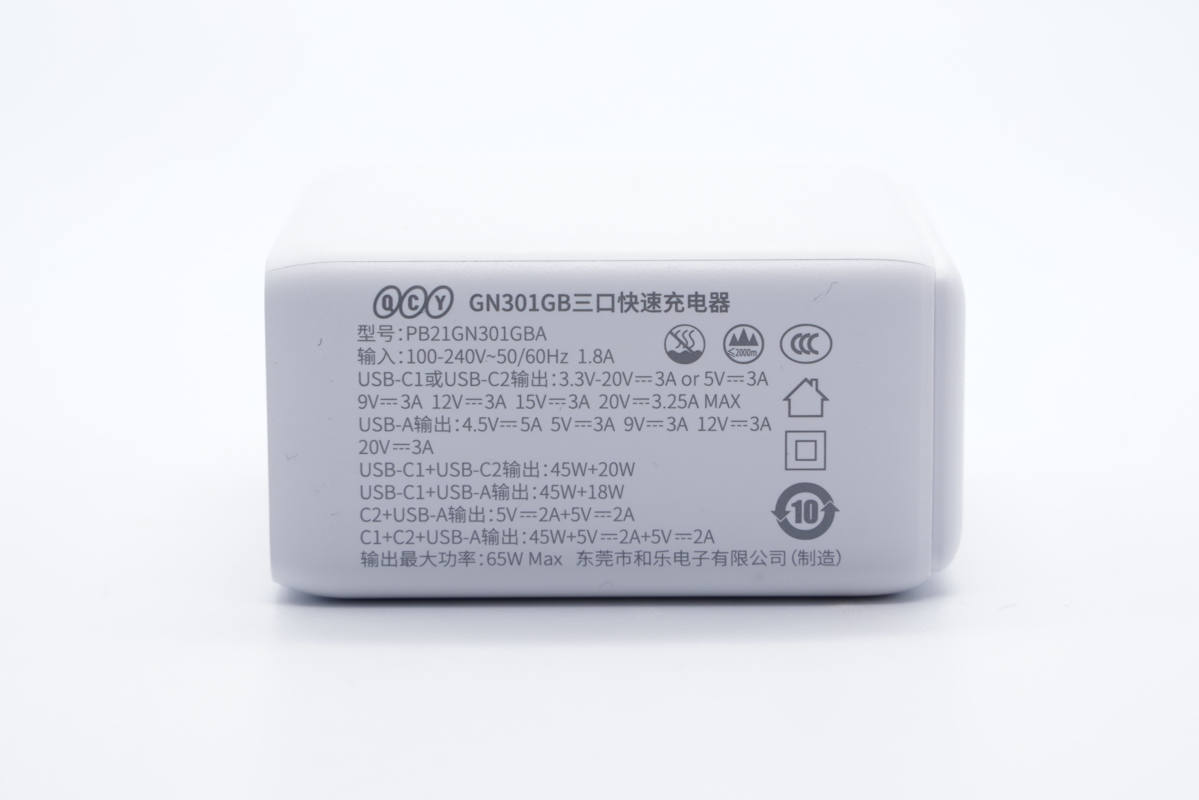 QCY意象新款65W氮化鎵充電器在外觀上和第一款的一樣,多增加了一個(gè)C口,最多可以同時(shí)為三臺(tái)設(shè)備充電,充電無(wú)需等待,提高充電效率。充電器的整體輸出性能也一樣強(qiáng)悍,支持QC、AFC、FCP、SCP、PE2.0、PD3.0、PPS全主流快充協(xié)議,具備5-20V齊全電壓檔位,支持3.3-21V3A PPS快充,可以很好兼容市面上絕大多數(shù)品牌設(shè)備。