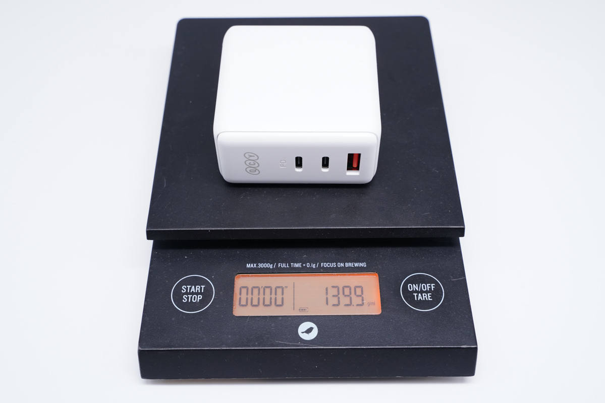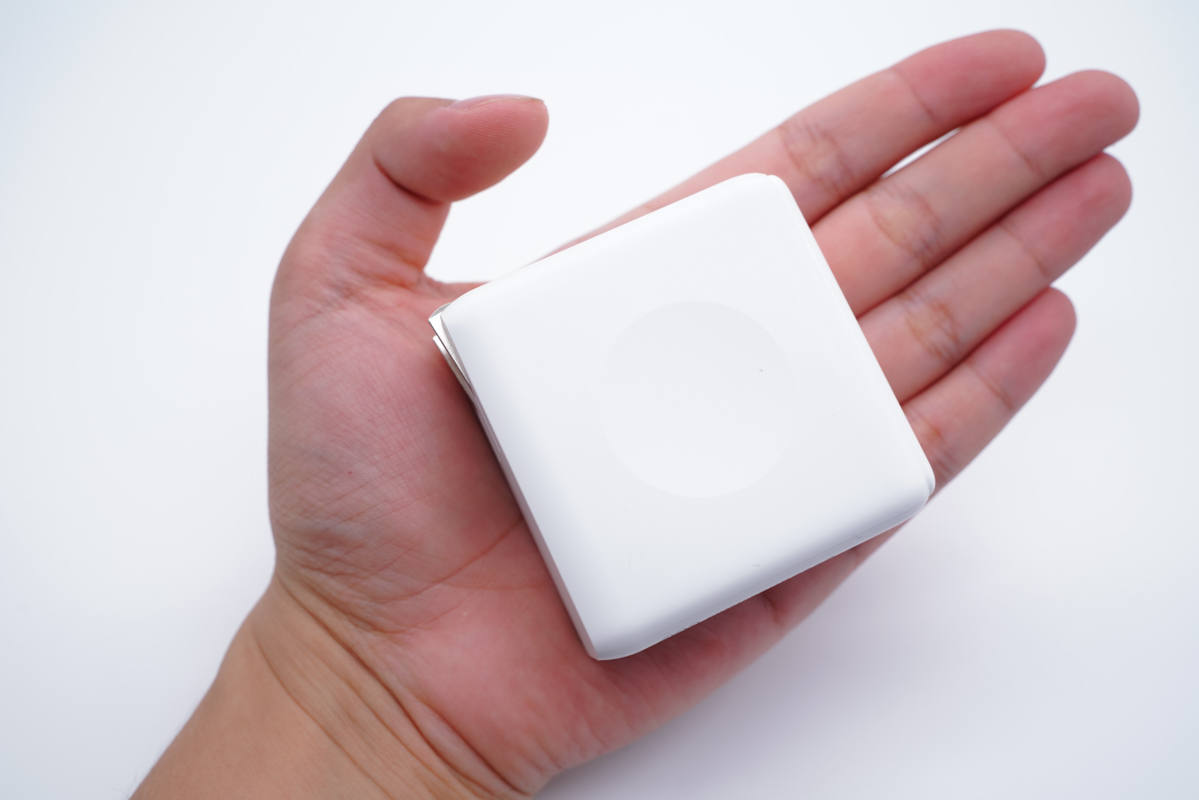 和蘋(píng)果61W充電器直觀對(duì)比,體積優(yōu)勢(shì)明顯。