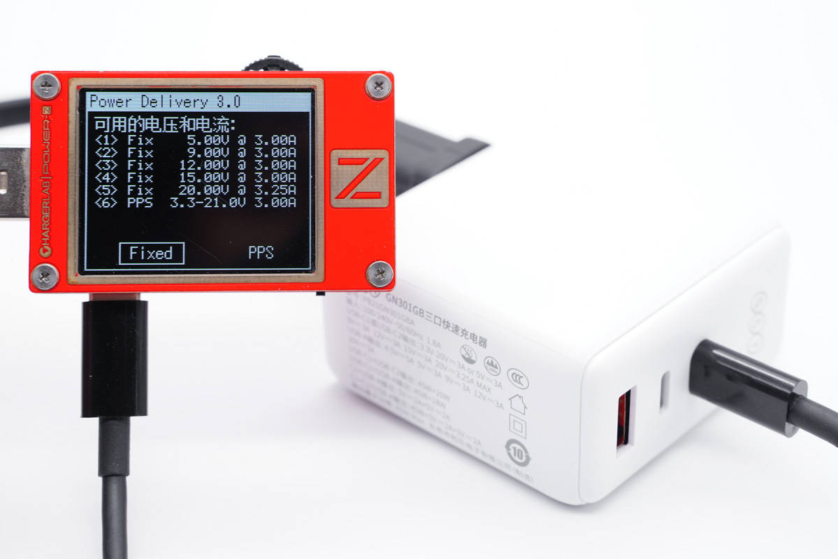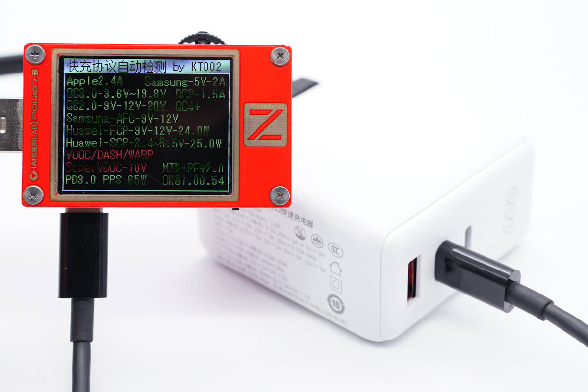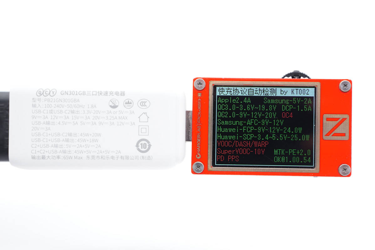 使用ChargerLAB POWER-Z KT002測(cè)得USB-C1口支持Apple 2.4A、Samsung 5V2A、DCP協(xié)議,以及QC2.0/3.0、AFC、FCP、SCP、PE2.0、PD3.0、PPS多個(gè)快充協(xié)議。