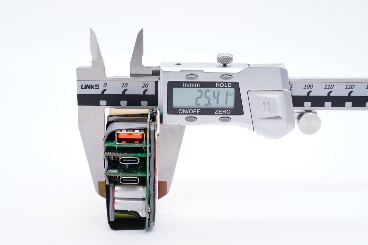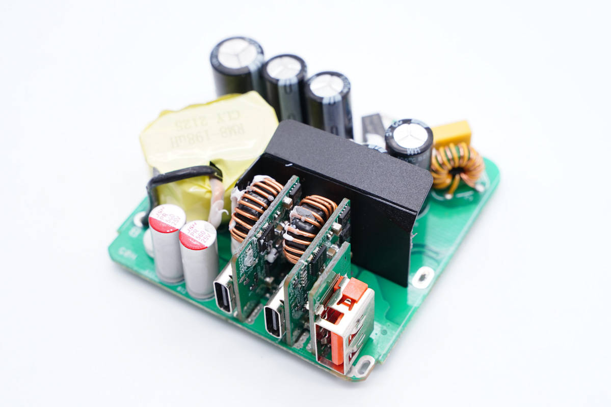 輸出端一覽,三個(gè)USB母座均焊接在小板上,左側(cè)還有兩顆濾波固態(tài)電容。