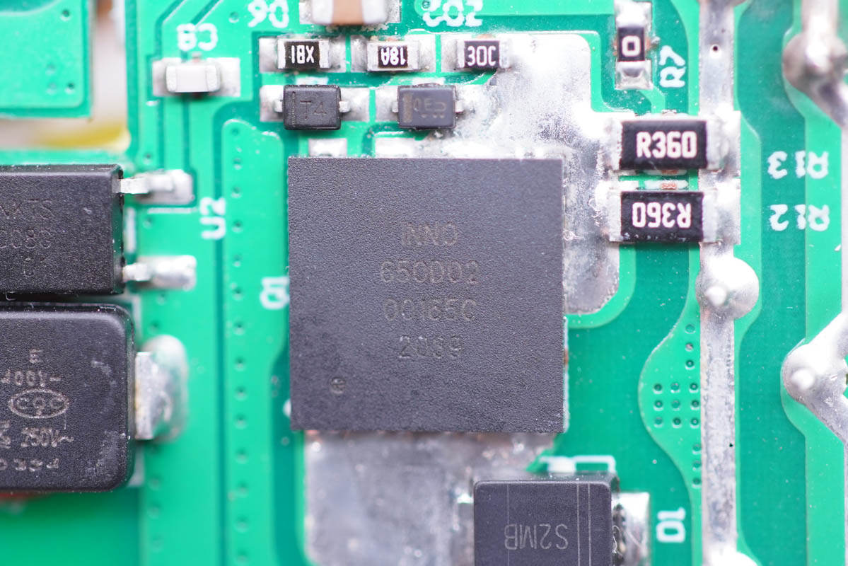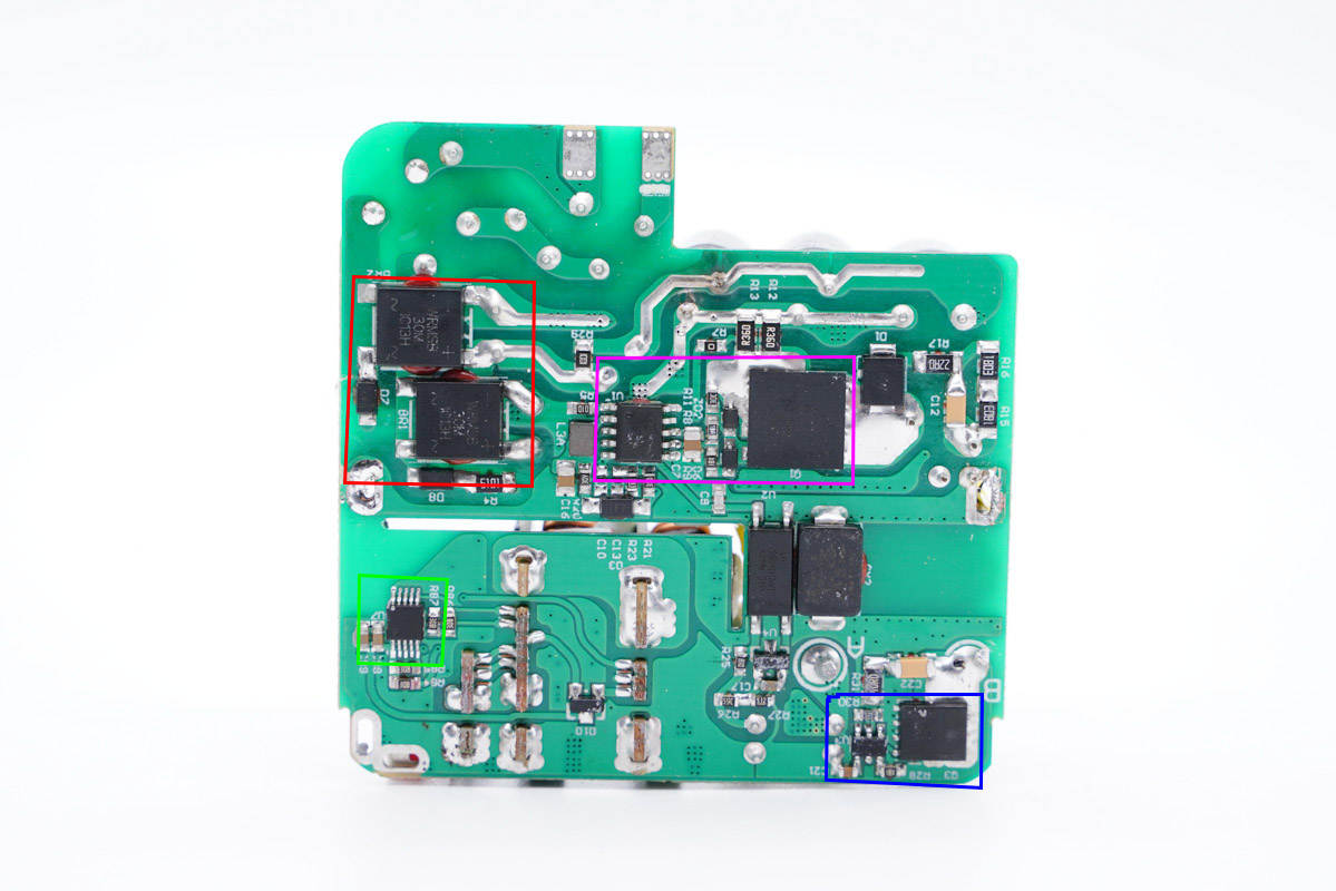 充電頭網(wǎng)通過(guò)拆解了解到,充電器采用南芯半導(dǎo)體SC3021C+SC3503高頻QR氮化鎵快充方案,搭配國(guó)產(chǎn)氮化鎵功率芯片英諾賽科INN650D02。另外兩路DC-DC電路均采用智融SW3516H方案。充電器全部采用的萬(wàn)京源電解電容和固態(tài)電容進(jìn)行輸入輸出濾波。PCBA模塊整體覆蓋導(dǎo)熱墊和散熱片,元器件打膠加固,初次級(jí)間設(shè)有隔離板。