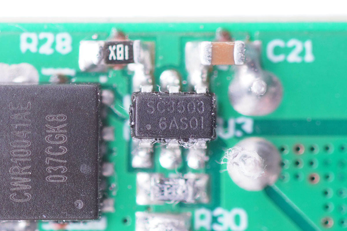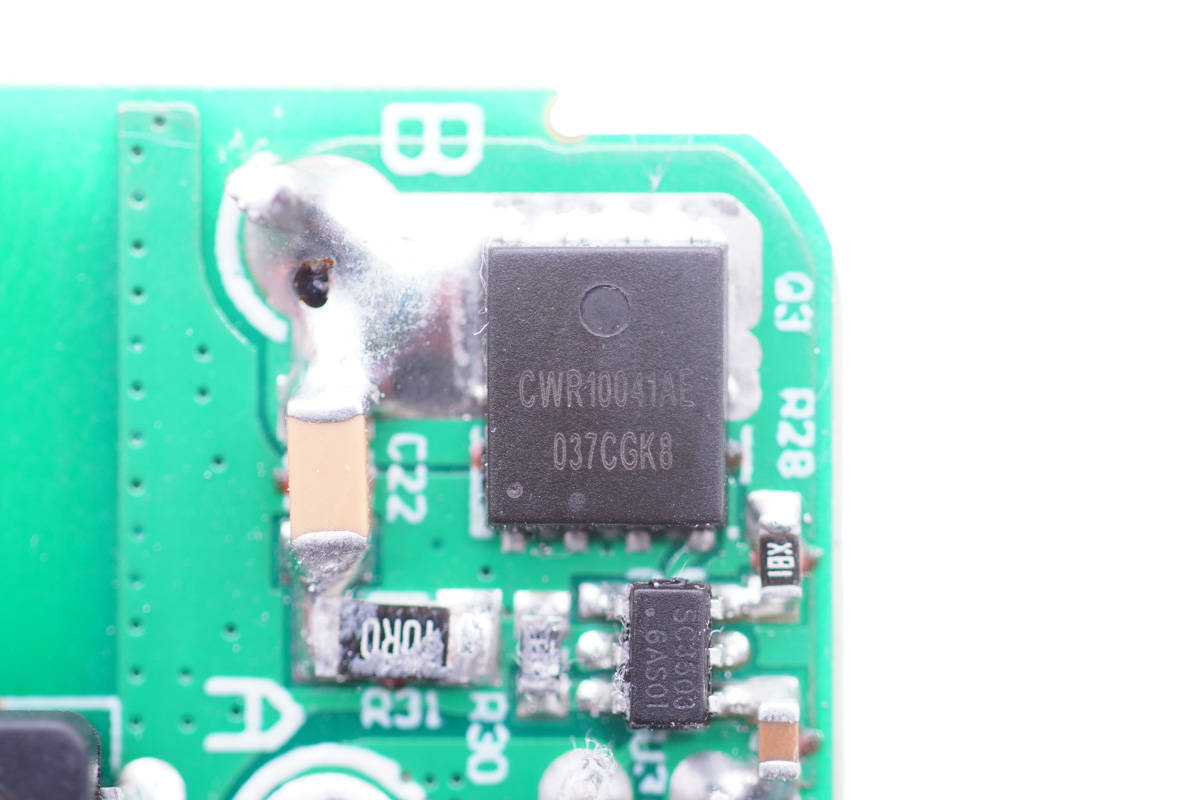 同步整流管特寫(xiě),絲印CWR10041AE。