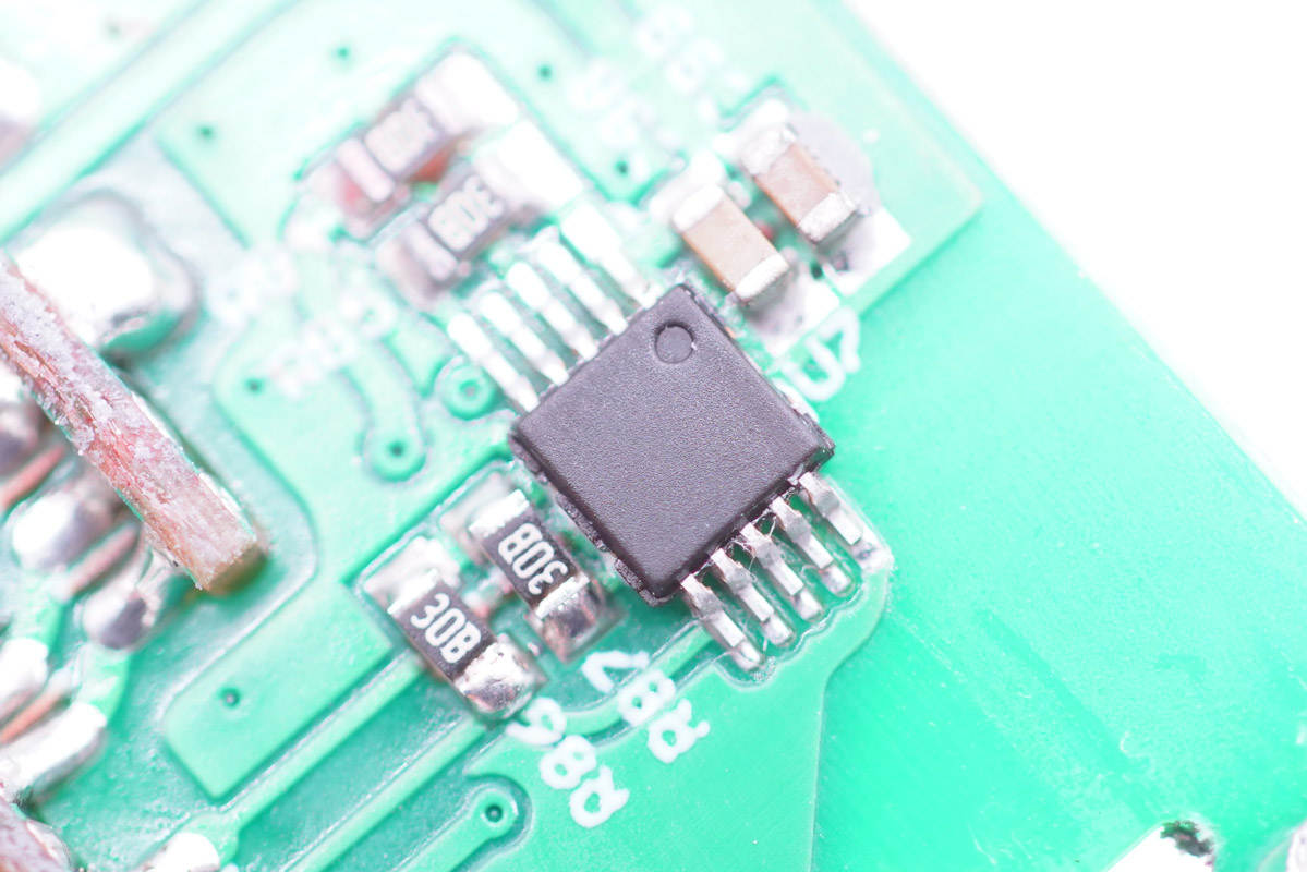 主板背面,設(shè)有整流橋、開(kāi)關(guān)電源核心器件、MCU等,整體外圍電路非常簡(jiǎn)潔,初次級(jí)間鏤空以穿過(guò)絕緣隔離板。