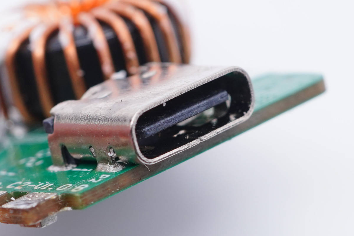 USB-C母座特寫(xiě),過(guò)孔焊接。