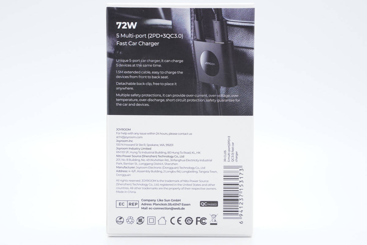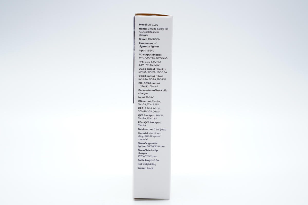 包裝盒正面印有JOYROOM品牌、產(chǎn)品型號JR-CL05、名稱、外觀圖和賣點等信息,設計相當豐富。
