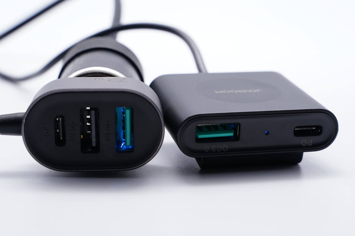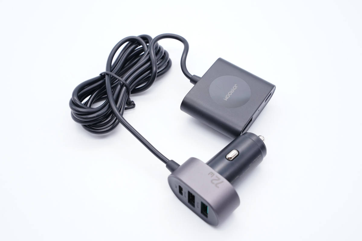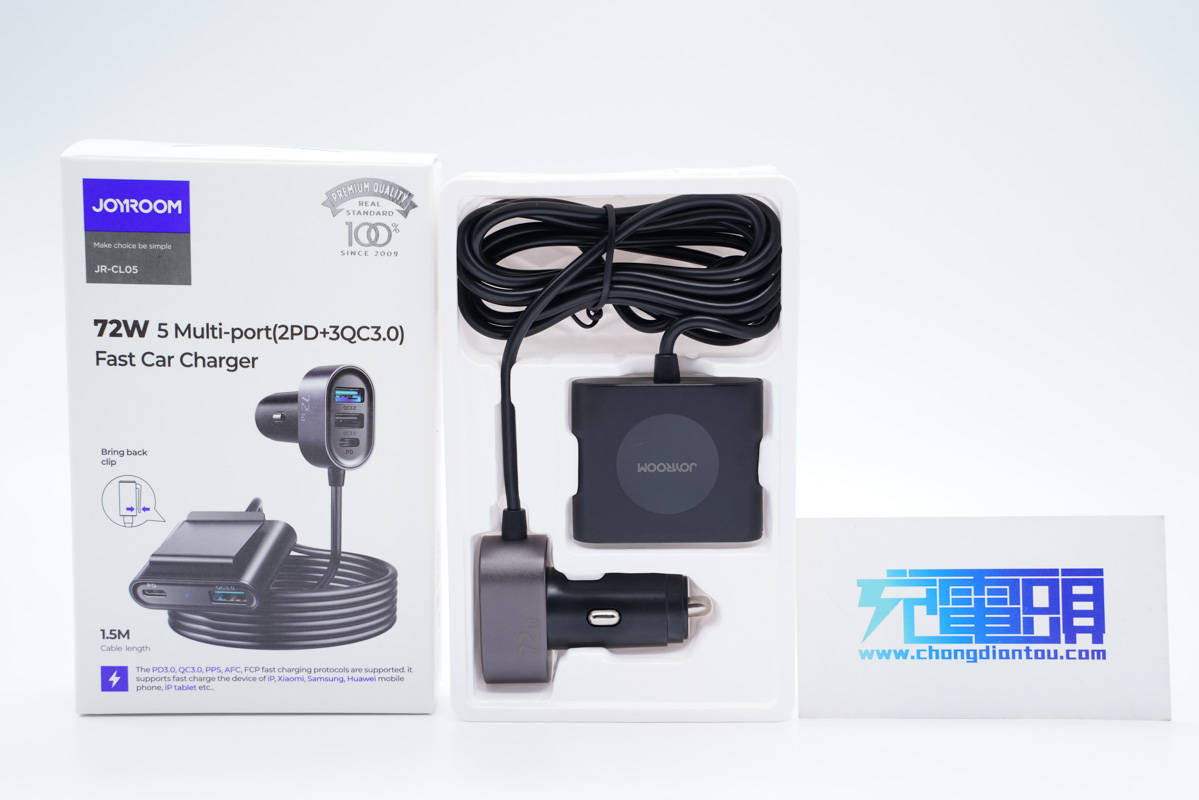 機樂堂這款72W多口車充由車充本體、背夾充電器和連接線纜三部分組成。