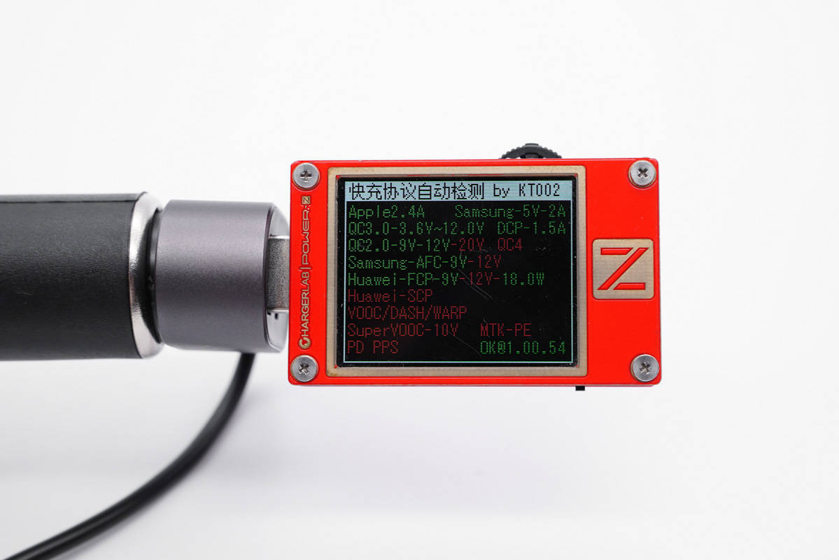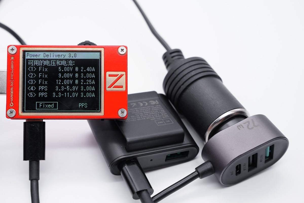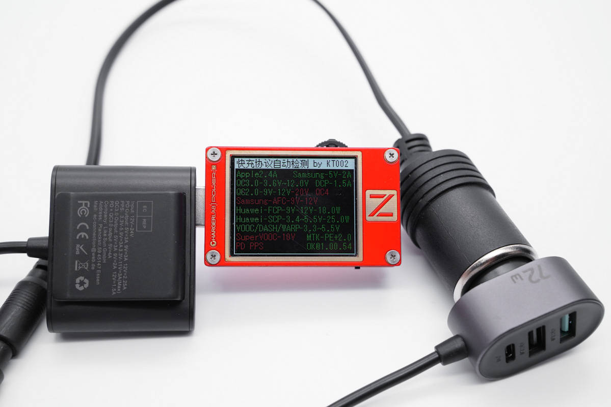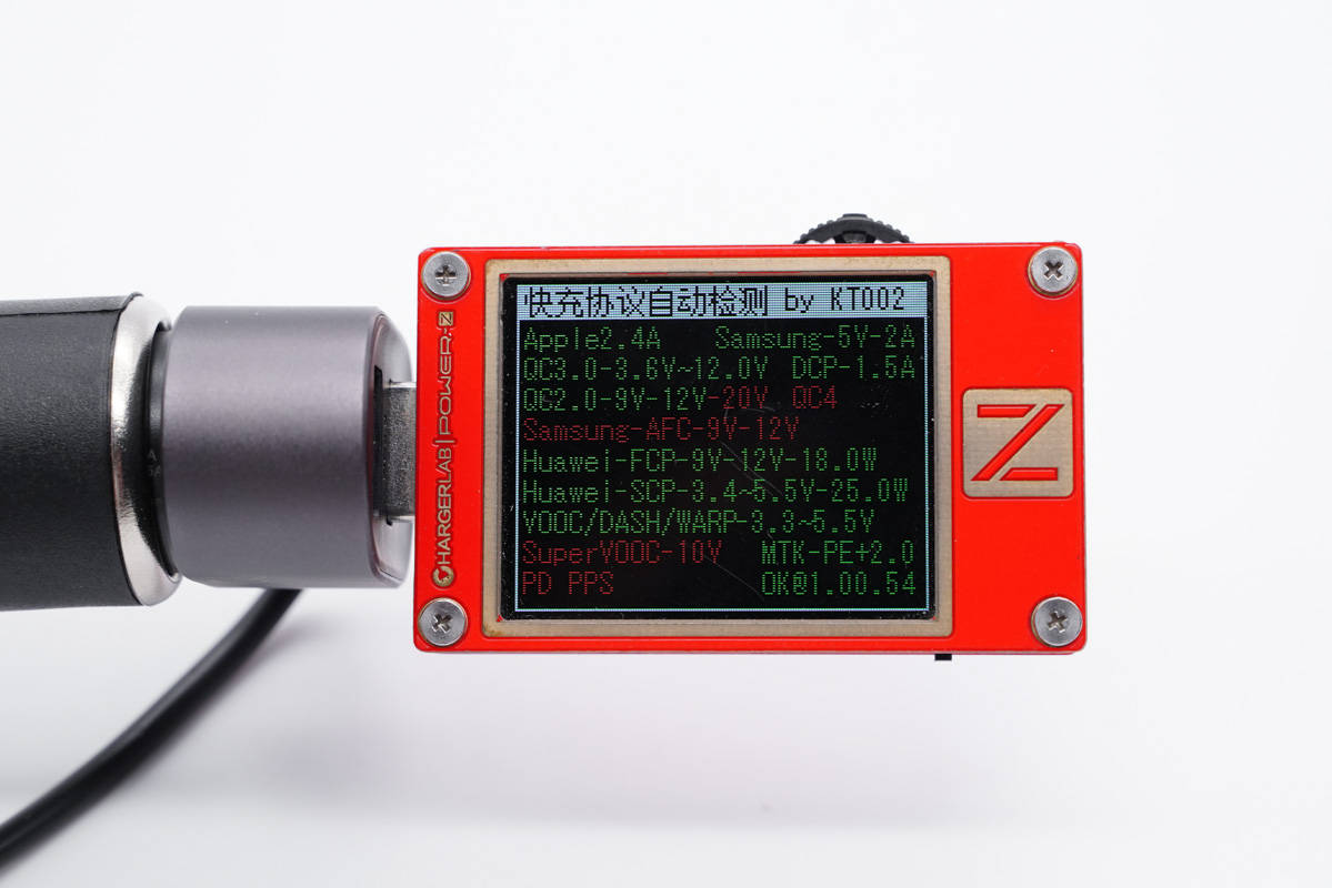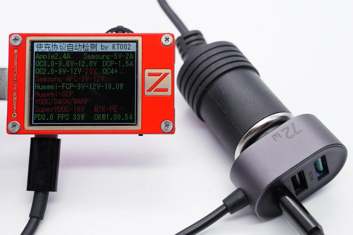 使用ChargerLAB POWER-Z KT002測得車充USB-A口(藍)支持Apple 2.4A、Samsung 5V2A、DCP協(xié)議,以及QC2.0/3.0、AFC、FCP快充協(xié)議。