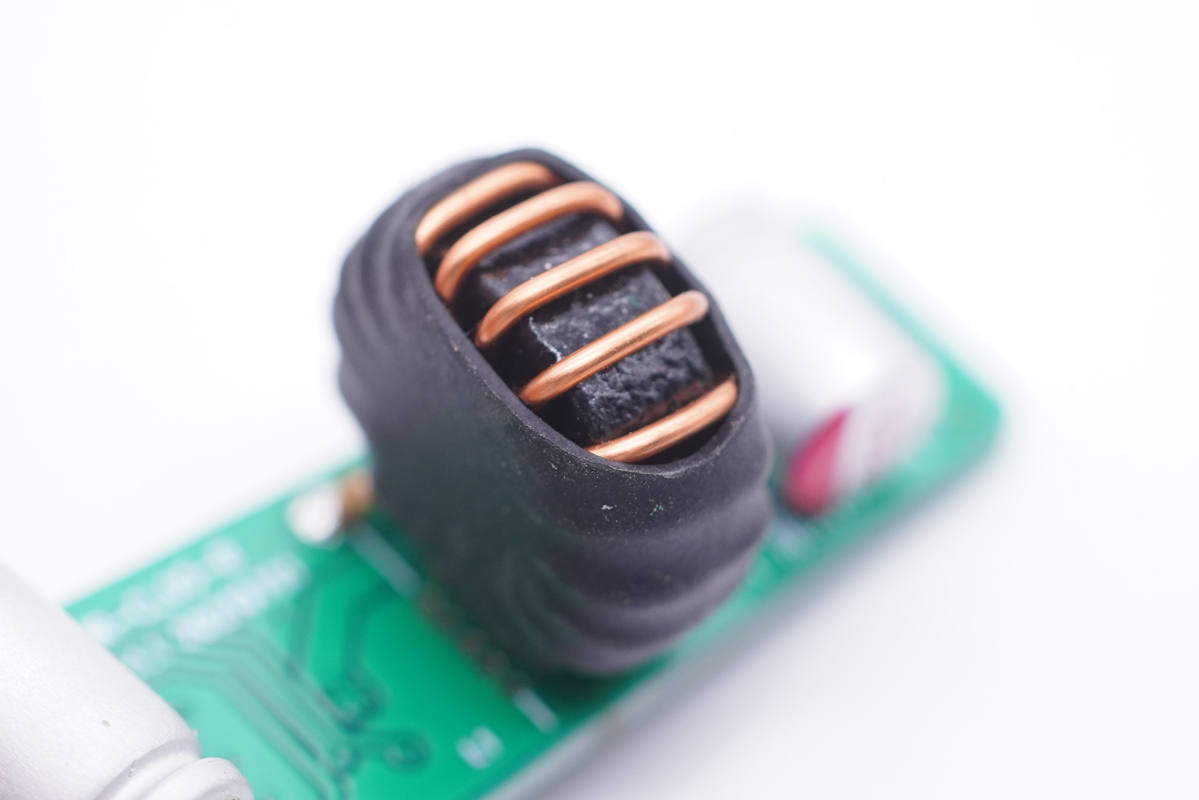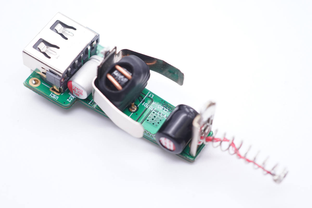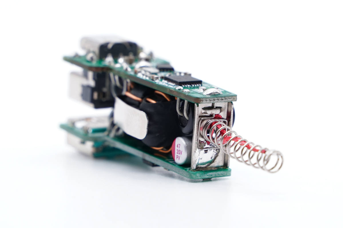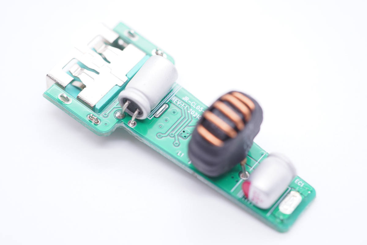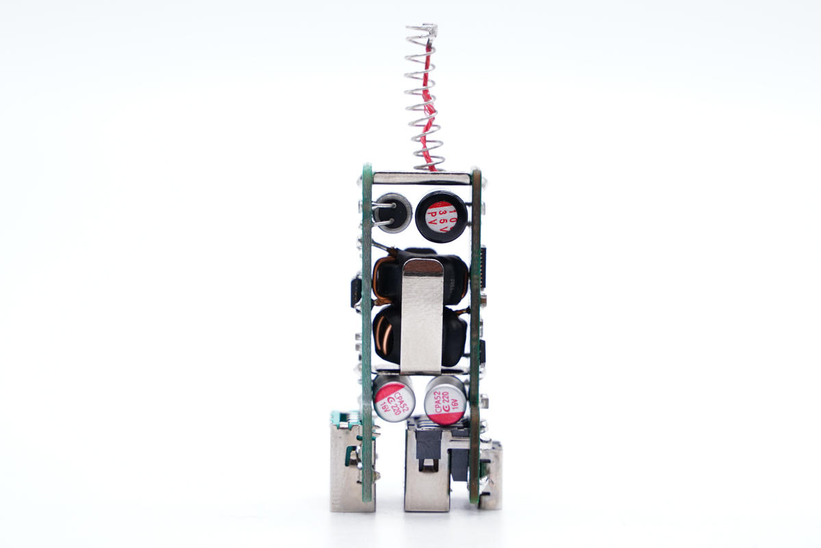 兩塊小板通過正負極金屬片連接固定,之間有輸入輸出濾波電容和電感。