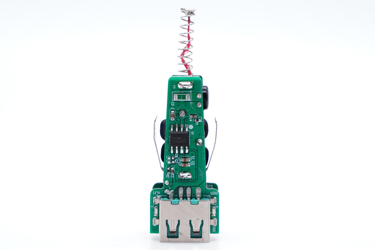 充電頭網(wǎng)通過拆解了解到,車充本體內(nèi)置兩顆PCB板,通過正負極金屬片焊接固定,設有兩路獨立降壓電路,分別采用英集芯IP6525T和IP6538降壓輸出方案。背夾充電器拆開發(fā)現(xiàn)也是采用的英集芯IP6538方案。每路電路均設有電容進行輸入輸出濾波,降壓電感外套絕緣管保護。