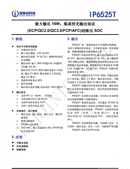 英集芯IP6525T是一款集成同步開關的降壓轉(zhuǎn)換器、支持4種輸出快充協(xié)議,其內(nèi)置功率MOS,降壓轉(zhuǎn)換效率高至98%,輸入電壓范圍是9.6V到32V,輸出電壓范圍是3V到12V,最大能提供18W的輸出功率。