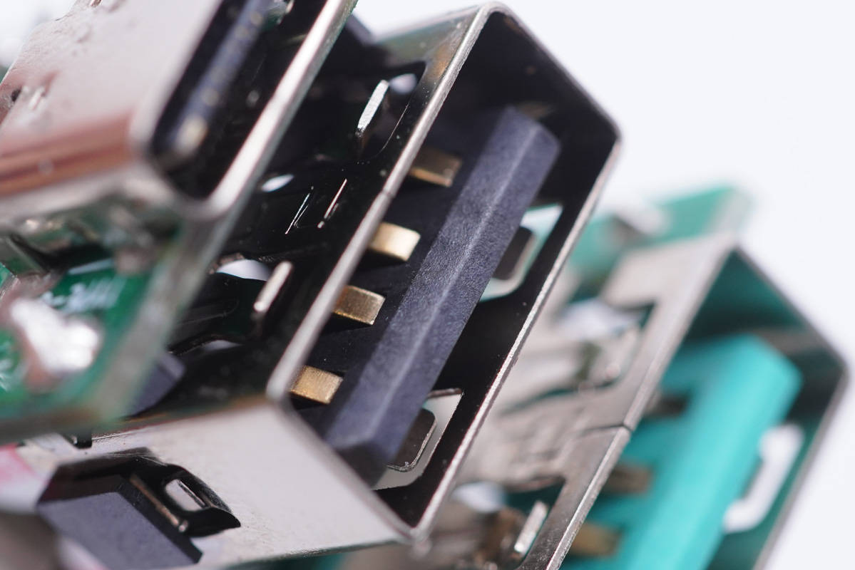 輸出頂面內(nèi)凹,配有2A1C三個接口,分別為黑色膠芯和藍色膠芯。