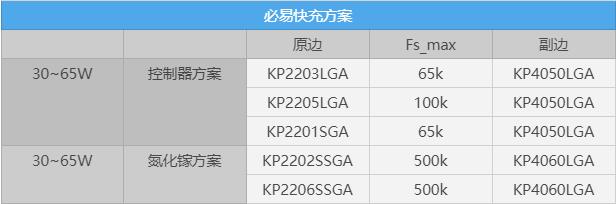 必易微針對65W功率段,推出了KP2201+KP4050的開關電源套片方案,支持27到65W的快充電源,適用于高性價比的快充電源和通用電源使用。