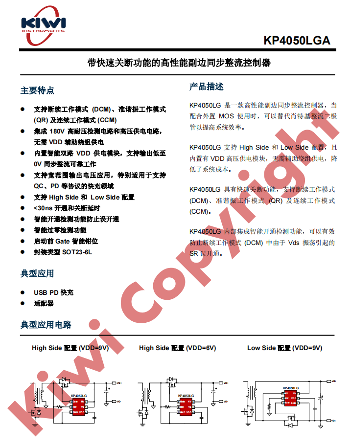 KP4050LGA還具有快速關斷功能,支持斷續工作模式(DCM)、準諧振工作模式(QR)及連續工作模式(CCM)。其內部集成智能開通檢測功能,可以有效防止斷續工作模式(DCM)中由于Vds振蕩引起的SR誤開通。