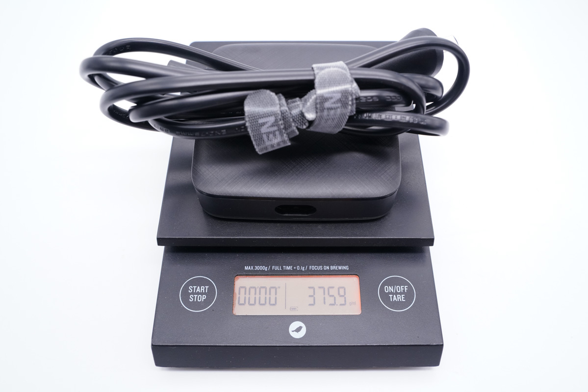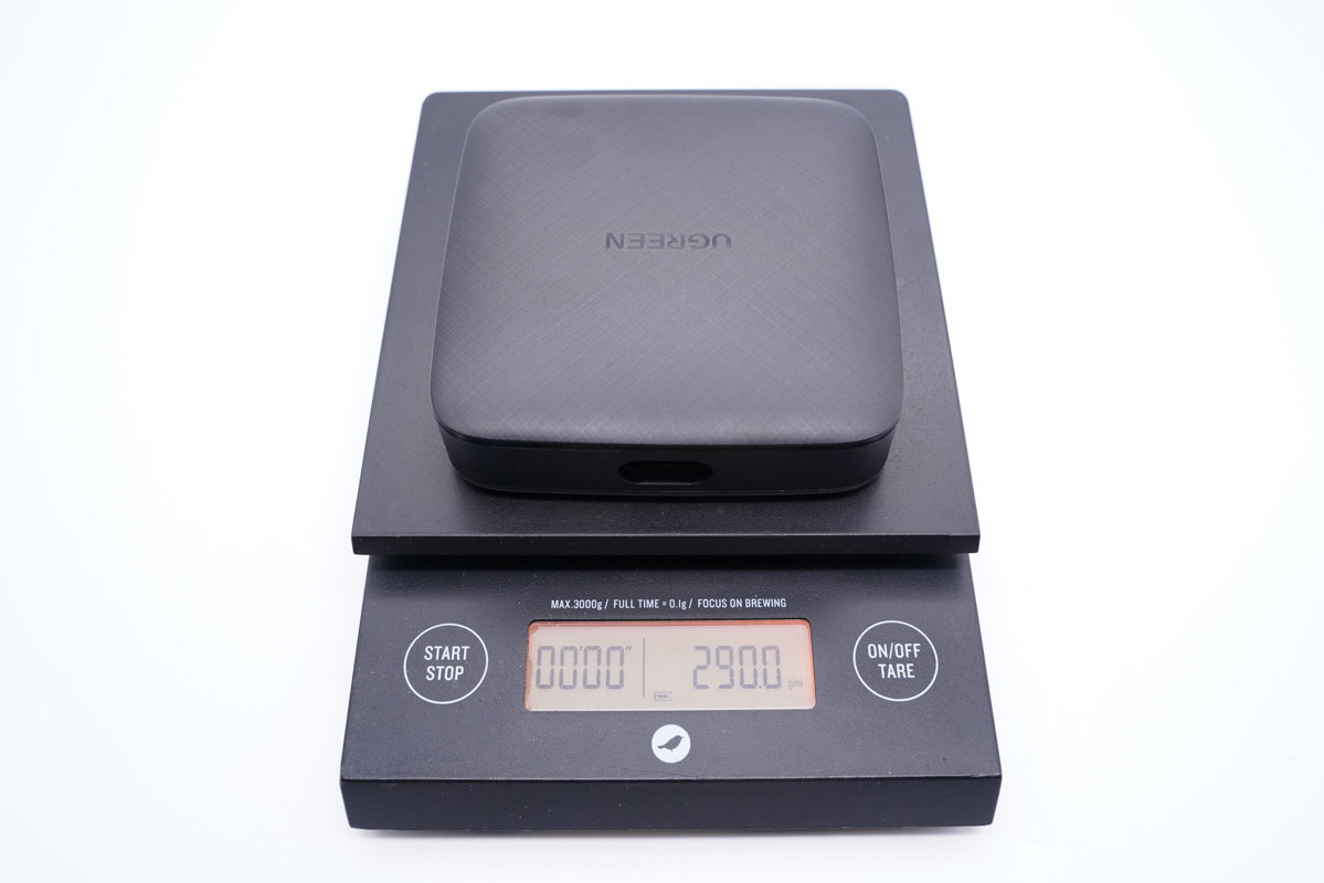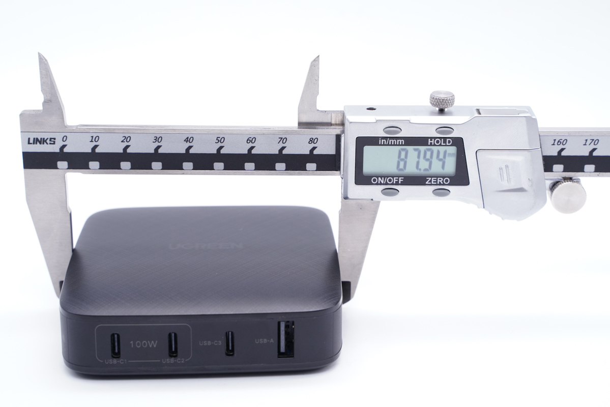 由此可以得出充電器的三圍參數為87.94x87.76x25.4mm,充電器的體積約為196.02cm3,以最高輸出100W計算,功率密度約為0.51W/cm3。