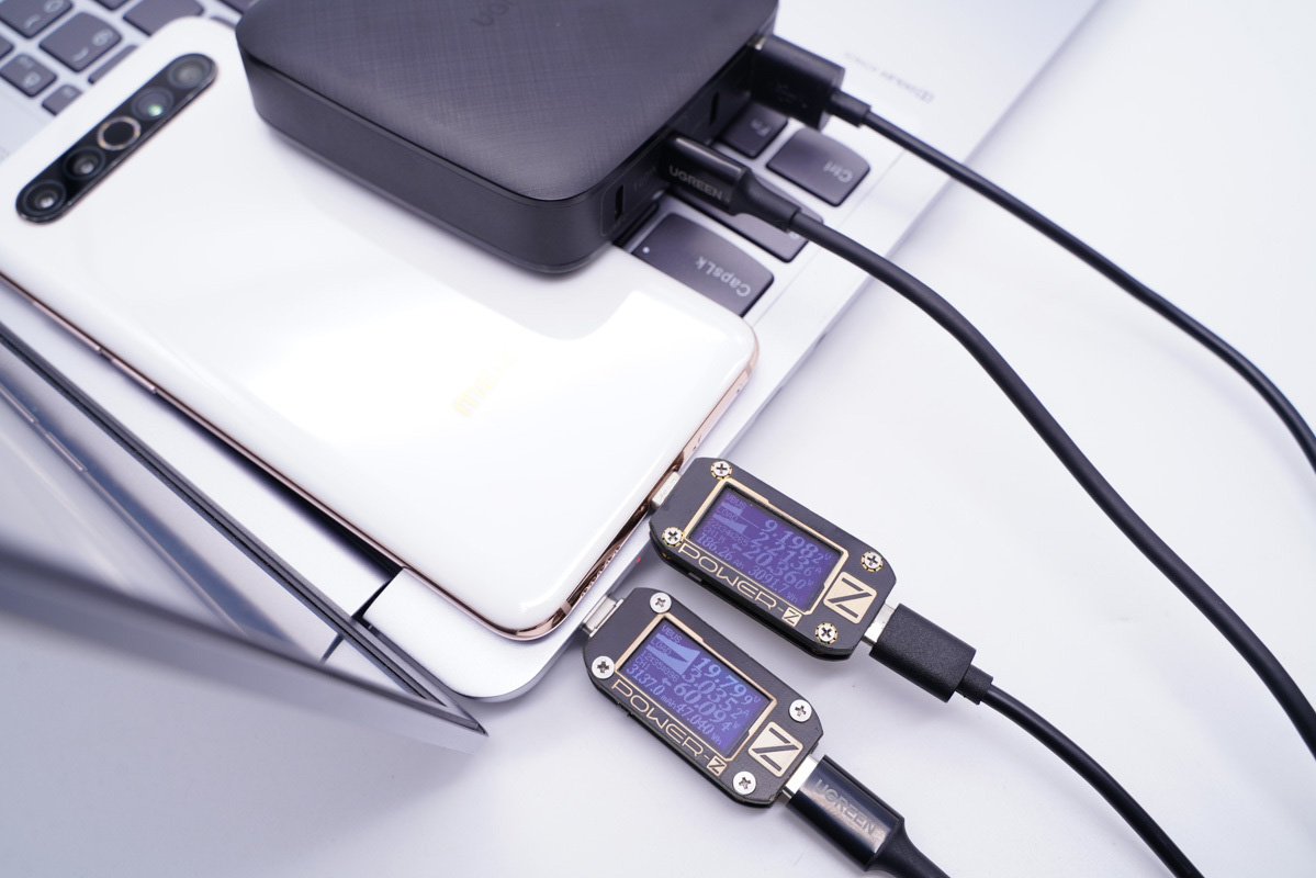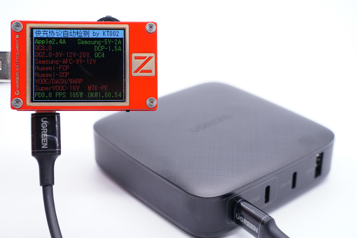 UGREEN綠聯100W桌面快充充電器配備了3C1A共4個USB接口,支持常見的絕大部分快充協議,C1和C2支持100W功率盲插,3.3-21V 5A寬電壓范圍的PPS加持使得其在為黑鯊4 Pro和努比亞Z30 Pro等機型充電時功率可以達到百瓦級別。C3和A口為同一路輸出設計,單獨使用支持20W和18W輸出功率,同時輸出調整為10.5W+10.5W。關于多口同時輸出在文章中也有詳細的測試,感興趣的可以向上翻看。