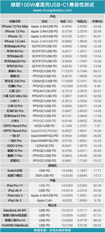 USB-C1的測試數據匯總,得益于3.3-21V寬范圍的PPS快充加持,USB-C1為部分手機充電功率可以達到近百瓦級別,表現不錯,只是對紅魔6 Pro的兼容性一般。